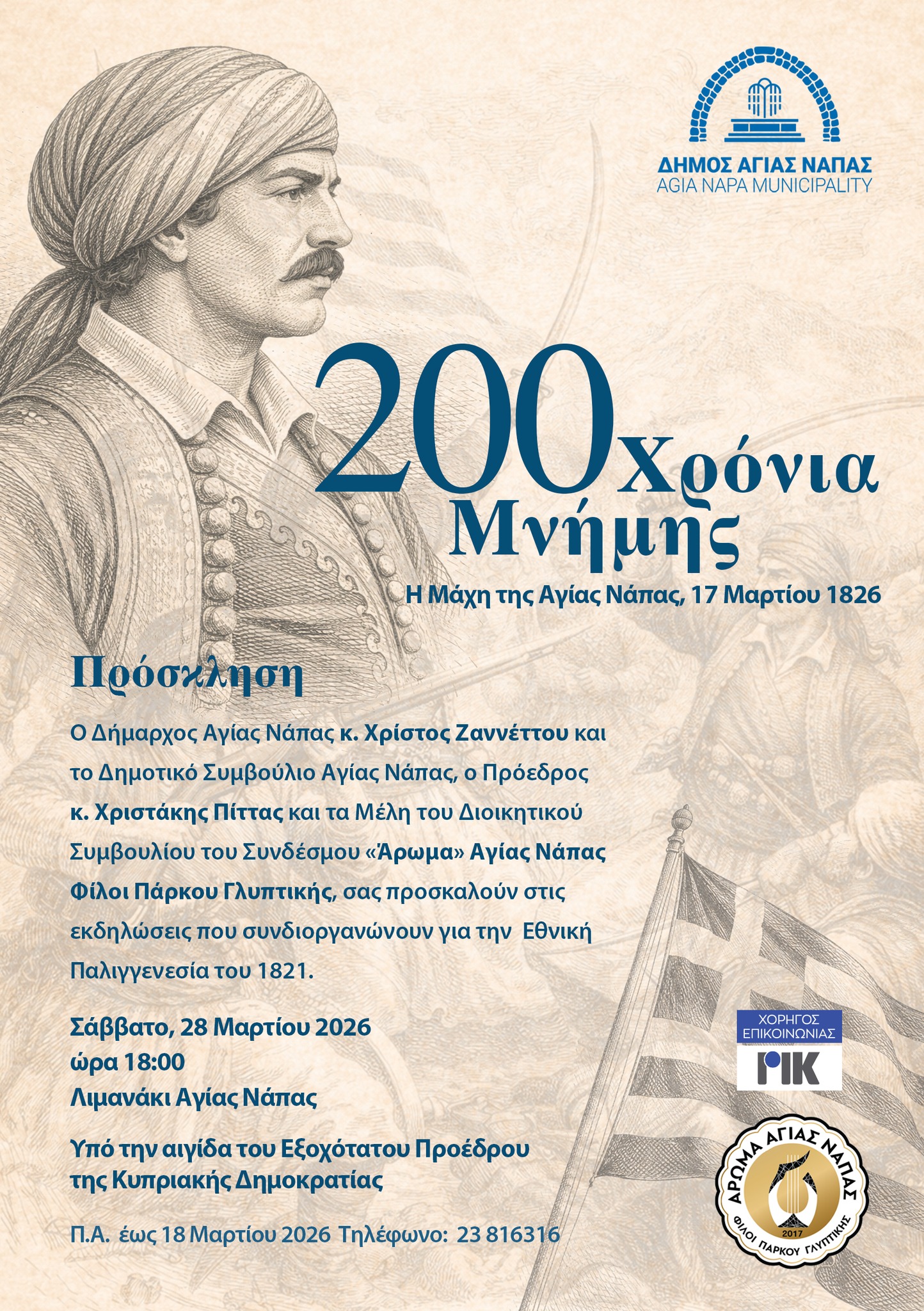 Μια ξεχωριστή επετειακή εκδήλωση με τίτλο «200 Χρόνια Μνήμης», για να τιμήσει τη μοναδική καταγεγραμμένη μάχη της Ελληνικής Επανάστασης στην Κύπρο, τη μάχη της Αγίας Νάπας που δόθηκε στις 17 Μαρτίου 1826) ανάμεσα στους Έλληνες επαναστάτες, με αρχηγό τον Χατζημιχάλη Νταλιάνη, και τις οθωμανικές δυνάμεις της περιοχής διοργανώνει το Σάββατο 28 Μαρτίου 2026, ο Δήμος Αγίας Νάπας σε συνεργασία με το Σύνδεσμο «Άρωμα» Αγίας Νάπας – Φίλοι Πάρκου Γλυπτικής.