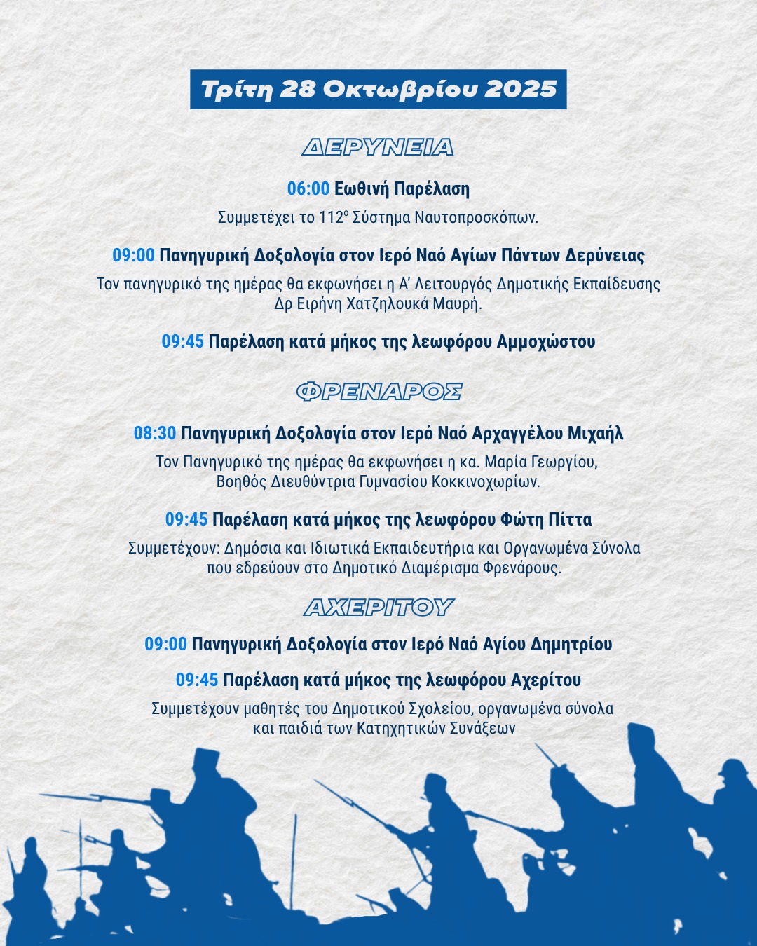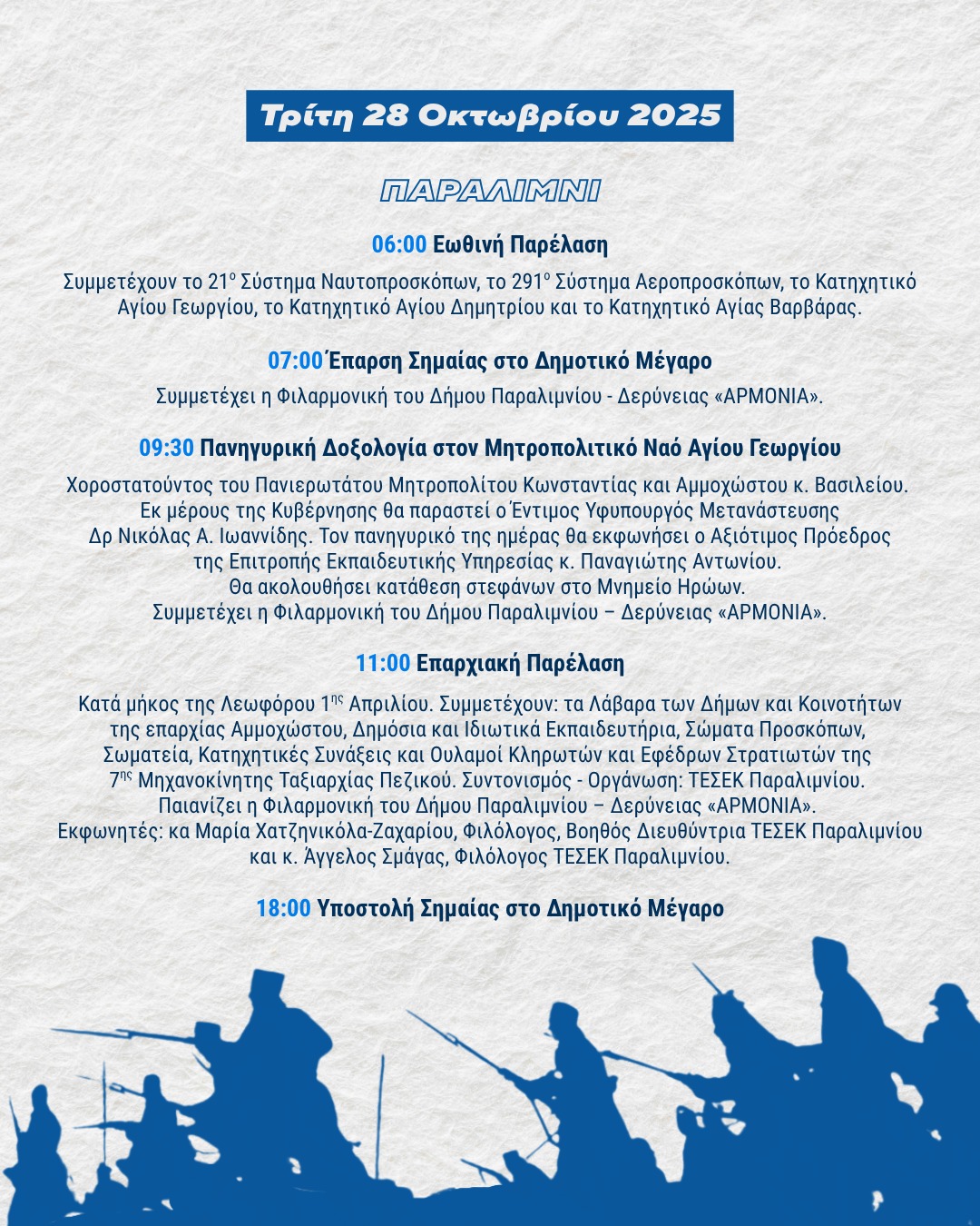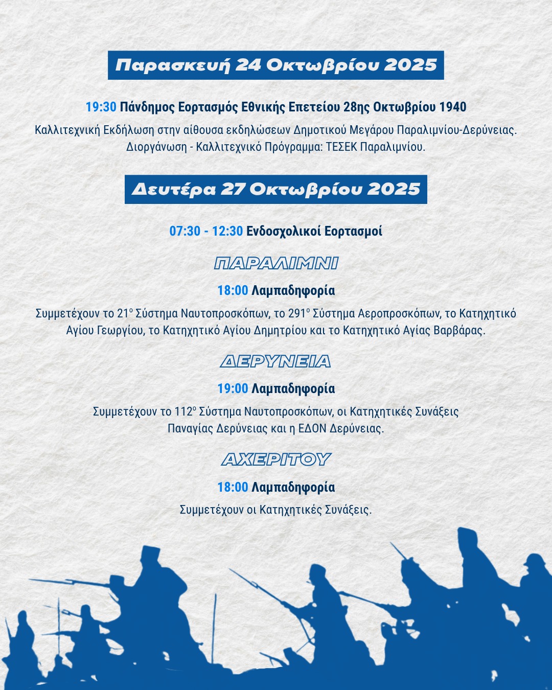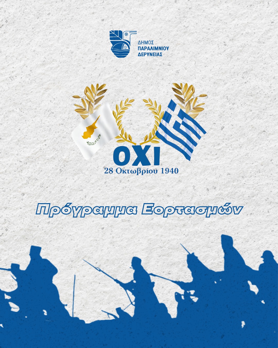 Αναλυτικό πρόγραμμα εορτασμών σε όλα τα δημοτικά διαμερίσματα του Δήμου Παραλιμνίου – Δερύνειας για τους εορτασμούς της Εθνικής Επετείου της 28ης Οκτωβρίου 1940.