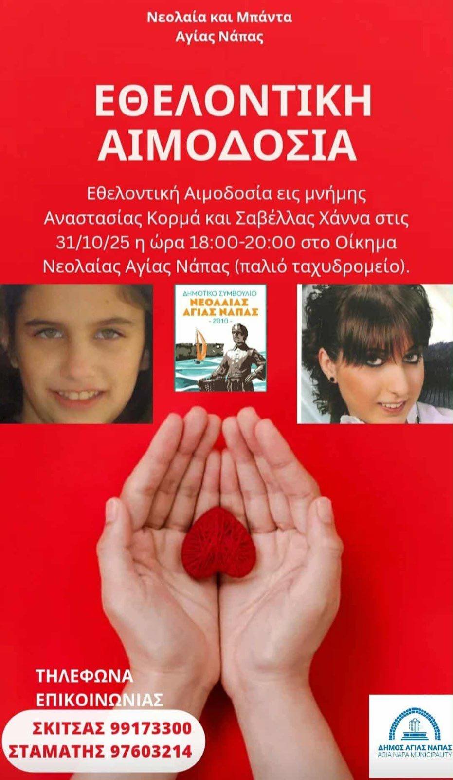 Το Συμβούλιο Νεολαίας Αγίας Νάπας και η Μπάντα Αγίας Νάπας, με τη στήριξη του Δήμου Αγίας Νάπας, διοργανώνουν Εθελοντική Αιμοδοσία, εις μνήμην των Αναστασίας Κορμά και Ισαβέλλας Χάννα, την Παρασκευή, 31 Οκτωβρίου 2025, από τις 18:00 έως τις 20:00, στο Οίκημα Νεολαίας Αγίας Νάπας (παλιό ταχυδρομείο).