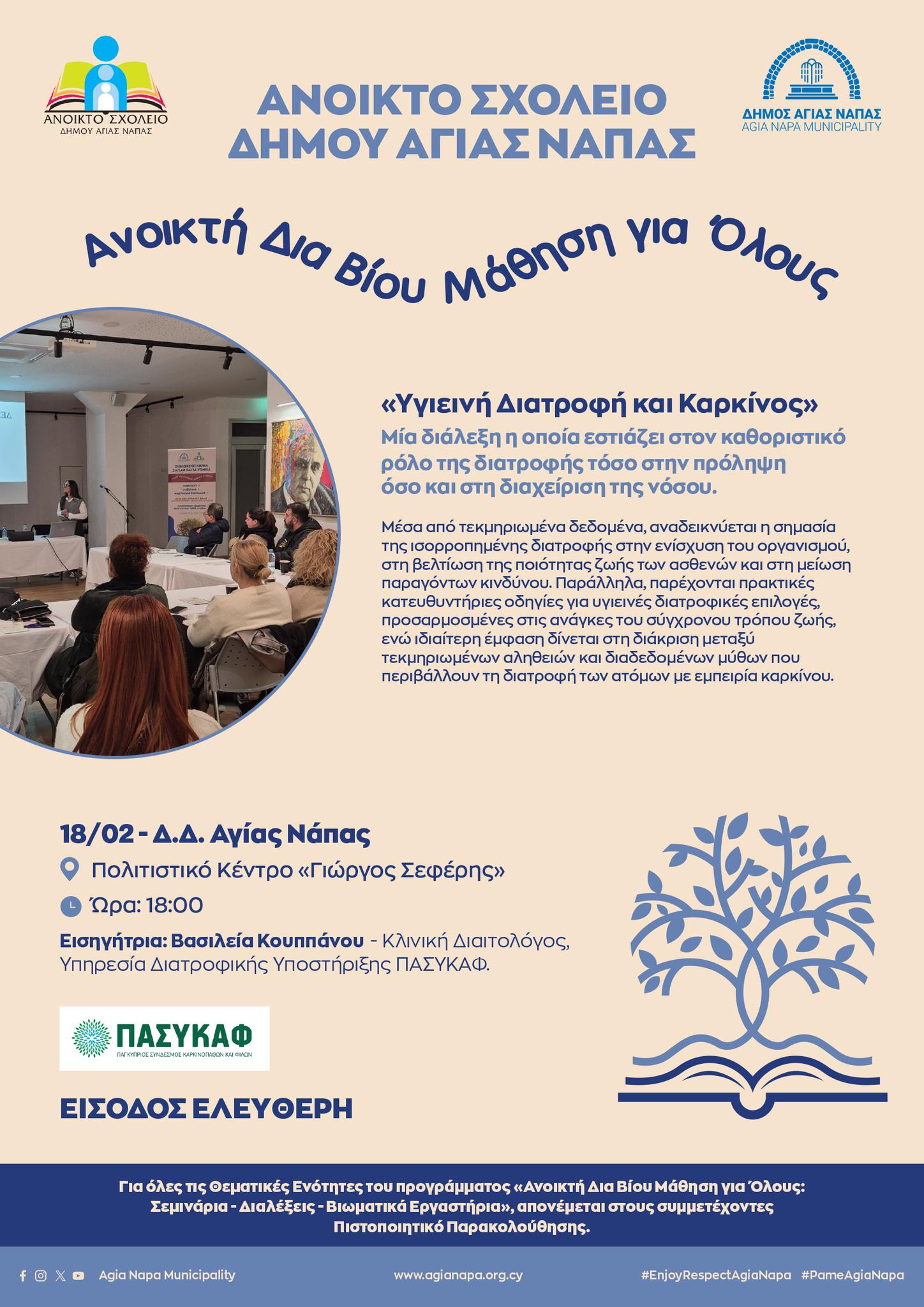 Η διάλεξη θα πραγματοποιηθεί την Τετάρτη 18 Φεβρουαρίου 2026, στο Πολιτιστικό Κέντρο «Γιώργος Σεφέρης» στην Αγία Νάπα, με ώρα έναρξης 18:00. Εισηγήτρια της διάλεξης είναι η Βασιλεία Κουππάνου, Κλινική Διαιτολόγος της Υπηρεσίας Διατροφικής Υποστήριξης του ΠΑΣΥΚΑΦ.