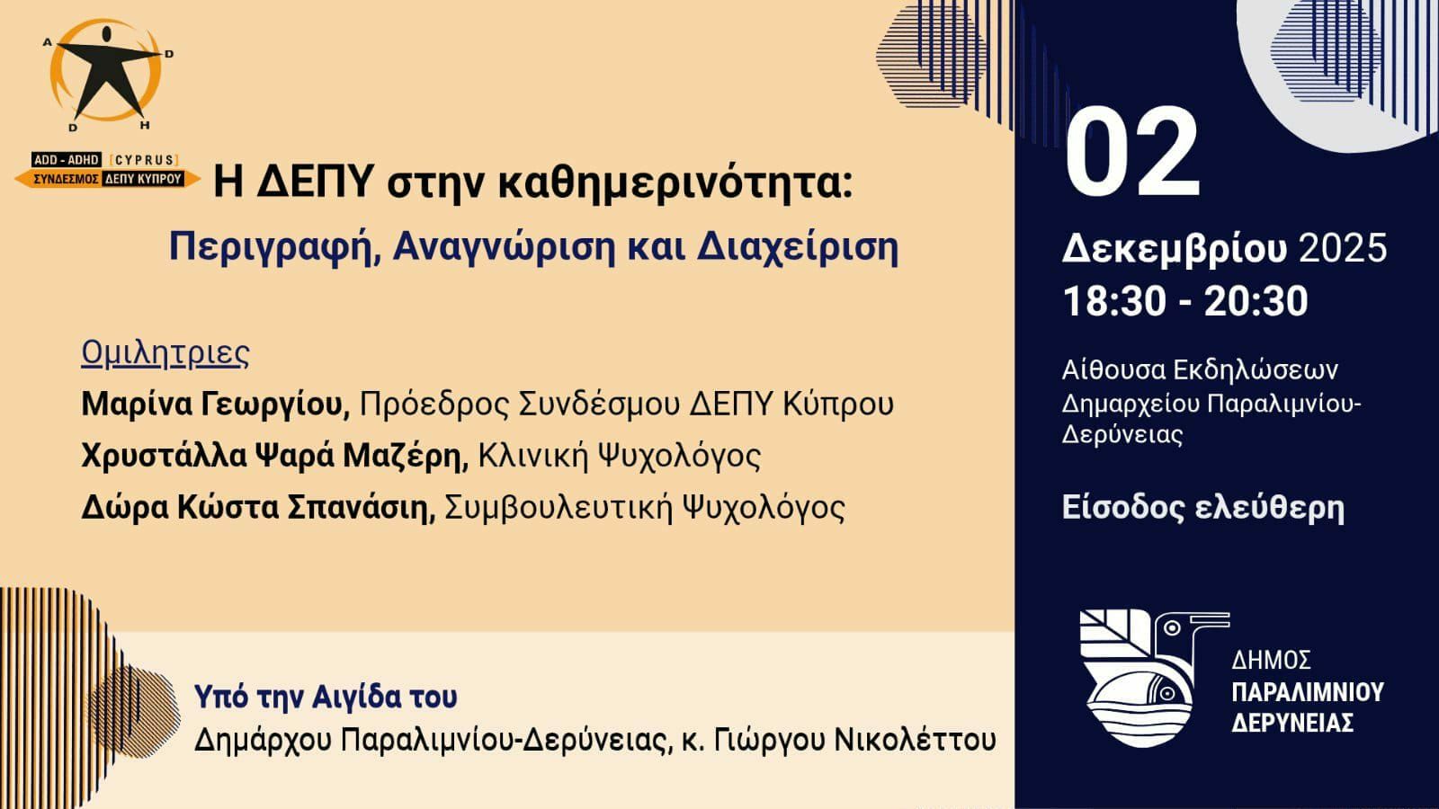 Εκδήλωση με θέμα “Η ΔΕΠΥ στην καθημερινότητα: Περιγραφή, Αναγνώριση και Διαχείριση” διοργανώνεται την Τρίτη 2 Δεκεμβρίου 2025, 18:30 – 20:30.