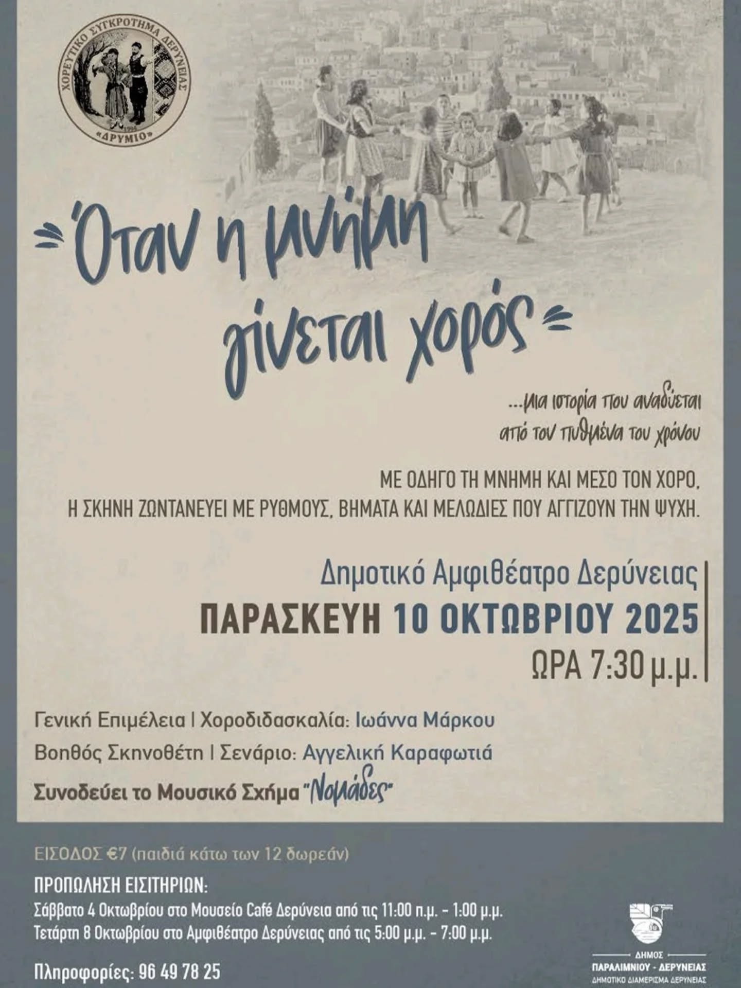Μουσικοχορευτική παράσταση «Όταν η μνήμη γίνεται χορός … μια ιστορία που αναδύεται από τον πυθμένα του χρόνου». Με οδηγό τη μνήμη και μέσο τον χορό, η σκηνή ζωντανεύει με ρυθμούς, βήματα και μελωδίες που αγγίζουν την ψυχή την Παρασκευή, 10 Οκτωβρίου 2025.