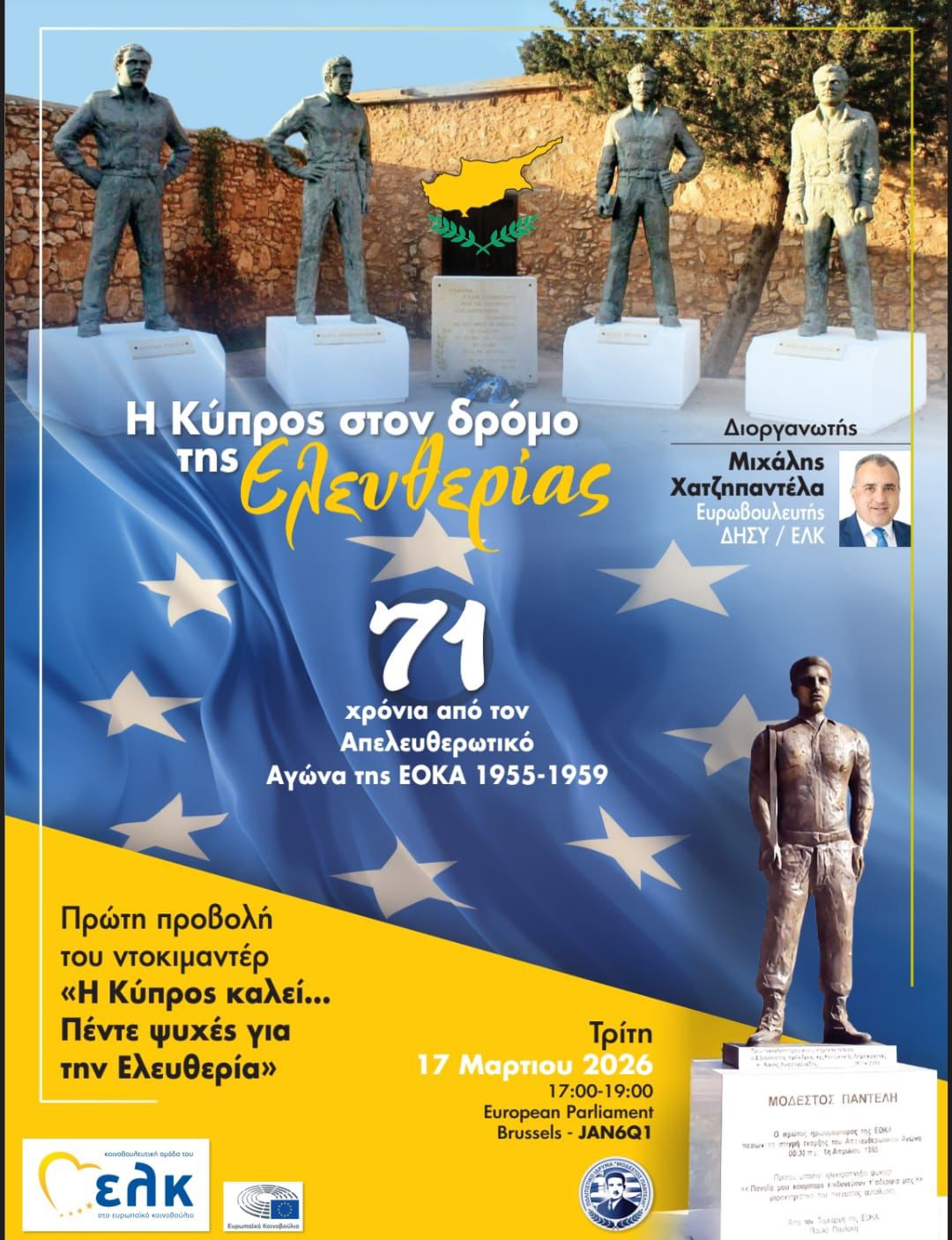 Η έναρξη των δράσεων θα πραγματοποιηθεί την Τρίτη 17 Μαρτίου 2026 στο Ευρωπαϊκό Κοινοβούλιο στις Βρυξέλλες, με την πρώτη προβολή του ντοκιμαντέρ «Η Κύπρος καλεί… Πέντε ψυχές για την ελευθερία». Την εκδήλωση διοργανώνει ο ευρωβουλευτής του Δημοκρατικού Συναγερμού Μιχάλης Χατζηπαντέλα όπου μέσα από ιστορικές μαρτυρίες και τεκμήρια αναδεικνύονται σημαντικές πτυχές του αγώνα της ΕΟΚΑ.