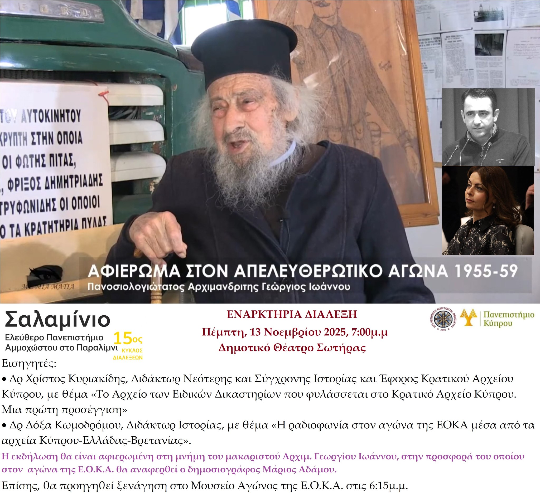 Η εναρκτήρια διάλεξη θα πραγματοποιηθεί την Πέμπτη, 13 Νοεμβρίου 2025 και ώρα 7:00μ.μ στο Δημοτικό Θέατρο Σωτήρας με κεντρικό θέμα τον αγώνα της Ε.Ο.Κ.Α. 1955-59.