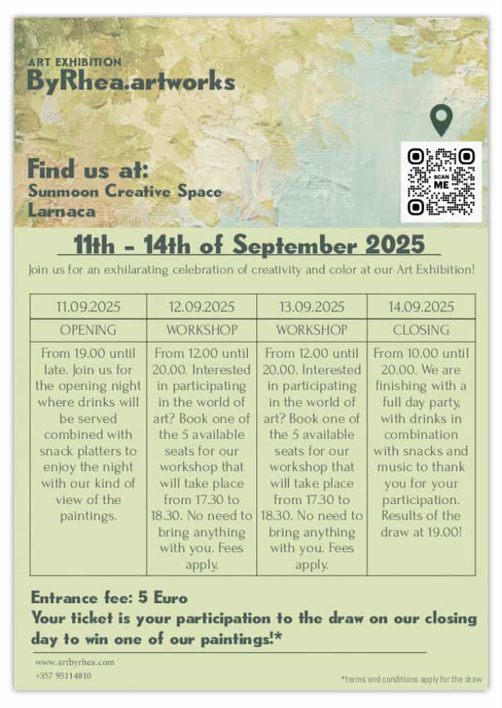 Η καλλιτέχνις Hera Herakleous, που ζει και δημιουργεί στη Λάρνακα, παρουσιάζει για πρώτη φορά στο κοινό τη δουλειά της μέσα από το brand ByRhea.artworks, με μία τετραήμερη έκθεση τέχνης στο Sunmoon Creative Space από τις 11 έως τις 14 Σεπτεμβρίου 2025.