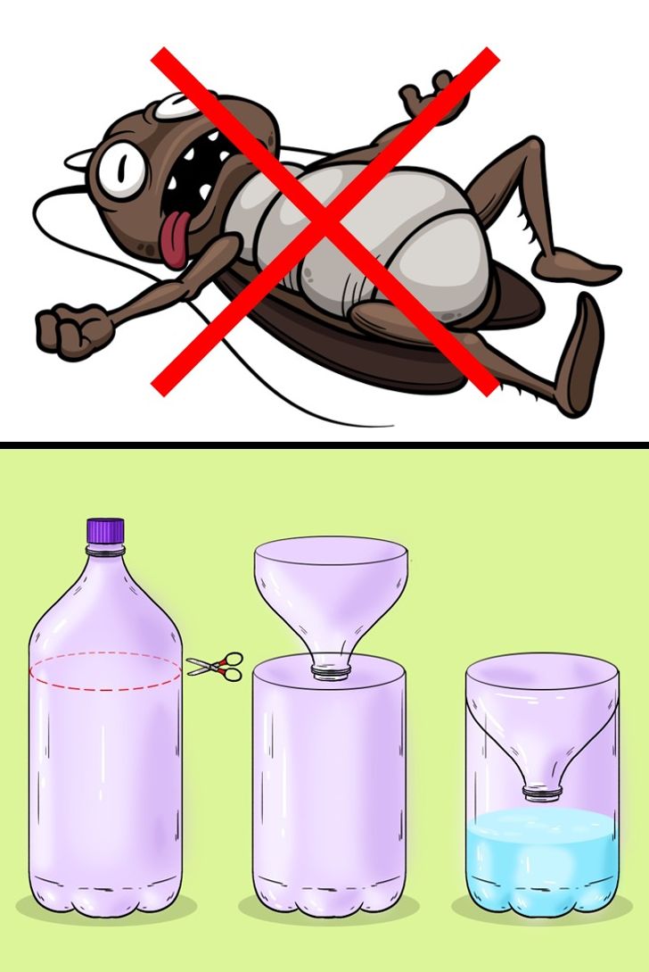 Οι κατσαρίδες βγαίνουν για φαγητό και νερό, οπότε έχετε μεγάλες πιθανότητες να μην τις δείτε ποτέ αν δεν υπάρχει τίποτα φαγώσιμο στο σπίτι. Εάν αυτό δεν είναι εφικτό, τότε φτιάξε μια παγίδα. Πάρτε ένα άδειο πλαστικό μπουκάλι από αναψυκτικό, κόψτε το πάνω μέρος και συναρμολογήστε το όπως φαίνεται στην παραπάνω εικόνα, ώστε να μοιάζει με χωνί. Σφραγίστε το με ταινία γύρω από το στόμιο. Ρίξτε λίγο νερό και τοποθετήστε την παγίδα όπου είναι πιθανό να εμφανιστούν οι κατσαρίδες. Μπορούν να μπουν αλλά δεν μπορούν να βγουν στην παγίδα σας. Ενώ αυτό το κόλπο παγιδεύει μεμονωμένες κατσαρίδες, η μέθοδος δεν επηρεάζει τη φωλιά τους.