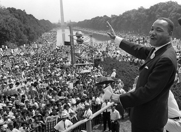 : WASHINGTON, UNITED STATES: US civil rights leader Martin Luther King,Jr. (C) waves to supporters from the steps of the Lincoln Memorial 28 August 1963 on the Mall in Washington DC (Washington Monument in background) during the 'March on Washington'. 28 August marks the 40th anniversary of the famous 'I Have a Dream' speech, which is credited with mobilizing supporters of desegregation and prompted the 1964 Civil Rights Act. Martin Luther King was assassinated on 04 April 1968 in Memphis, Tennessee. James Earl Ray confessed to shooting King and was sentenced to 99 years in prison. AFP PHOTO/FILES (Photo credit should read AFP/AFP/Getty Images)