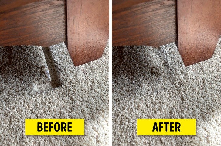 Εάν αποφασίσετε να ξεφορτωθείτε ή να μετακινήσετε ένα έπιπλο, ίσως παρατηρήσετε ότι αφήνει μια εσοχή στο χαλί. Για να την αφαιρέσετε, πάρτε μια υγρή πετσέτα και βάλτε την πάνω από την εσοχή. Στη συνέχεια θερμαίνετε την πετσέτα με σίδερο ατμού. Κάθε τόσο σηκώστε την πετσέτα και αφρατέψτε τις ίνες του χαλιού. Επαναλάβετε μερικές φορές μέχρι να δείτε το επιθυμητό αποτέλεσμα.