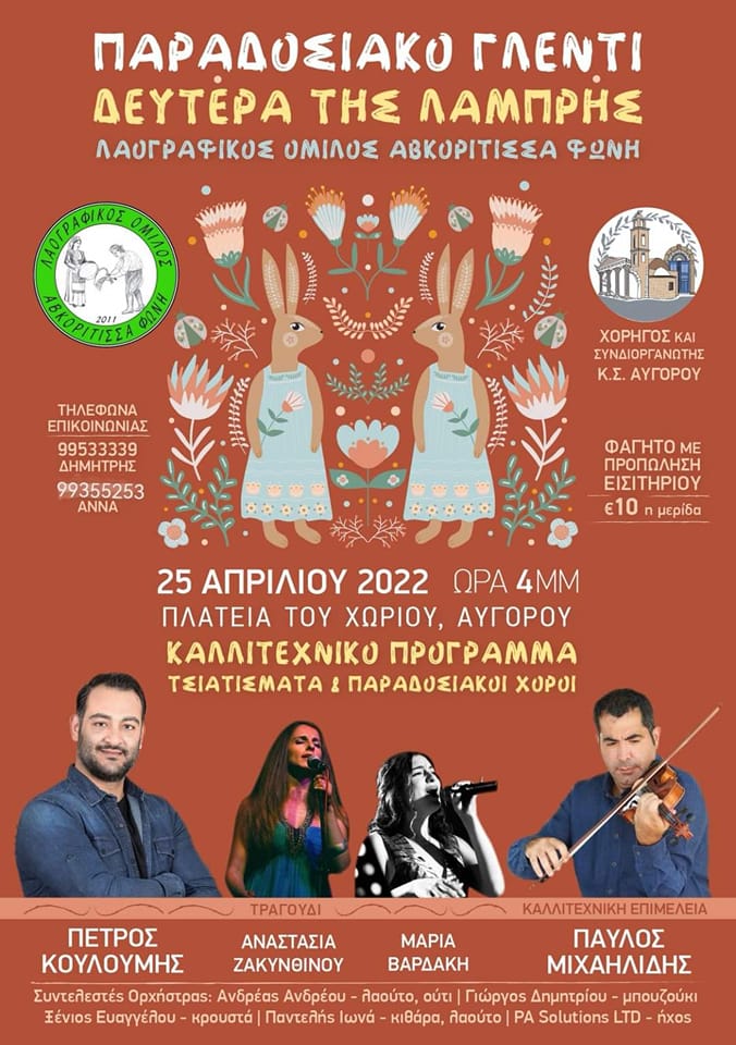 Tην Δευτέρα του Πάσχα 25 Απριλίου 2022 στην Πλατεία της Κοινότητας Αυγόρου, μετά απο 3 χρόνια επιστρέφει η καθιερωμένη πασχαλινή γιορτή του Λαογραφικού Ομίλου “Αβκορίτισσα Φωνή” όπου θα μας κρατήσει συντροφιά με χορούς και τραγούδια της παράδοσης μας .