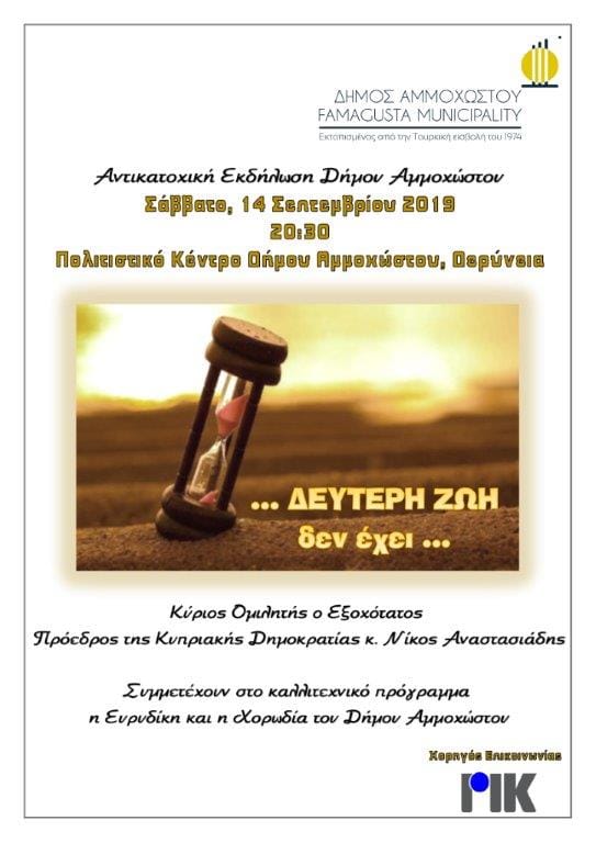 Πραγματοποιείται απόψε στις 8.30 μμ η αντικατοχική εκδήλωση του Δήμου Αμμοχώστου, στο Πολιτιστικό Κέντρο του Δήμου στη Δερύνεια.