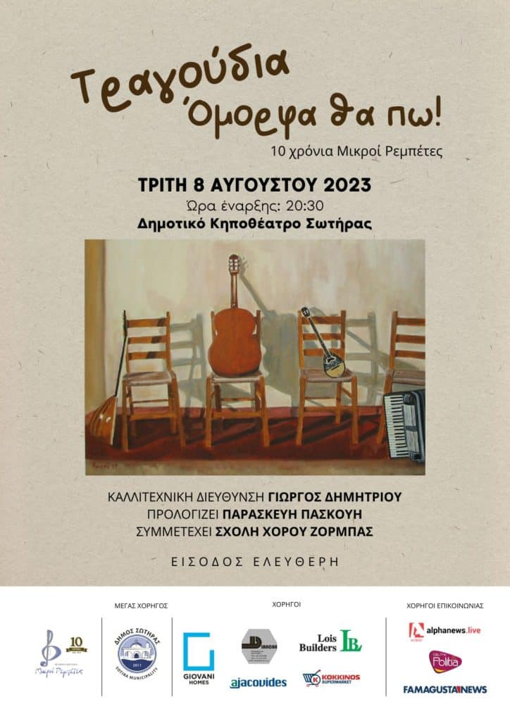 Δέκα χρόνια ζωής και προσφοράς στο ρεμπέτικο, λαϊκό τραγούδι γιορτάζει φέτος η πολυμελής χορωδιακή ομάδα «Μικροί Ρεμπέτες» και το γιορτάζει με την μουσικοχορευτική παράσταση «Τραγούδια όμορφα θα πω…» απόψε Τρίτη 8 Αυγούστου στο Δημοτικό Κηποθέατρο Σωτήρας με ελεύθερη είσοδο.