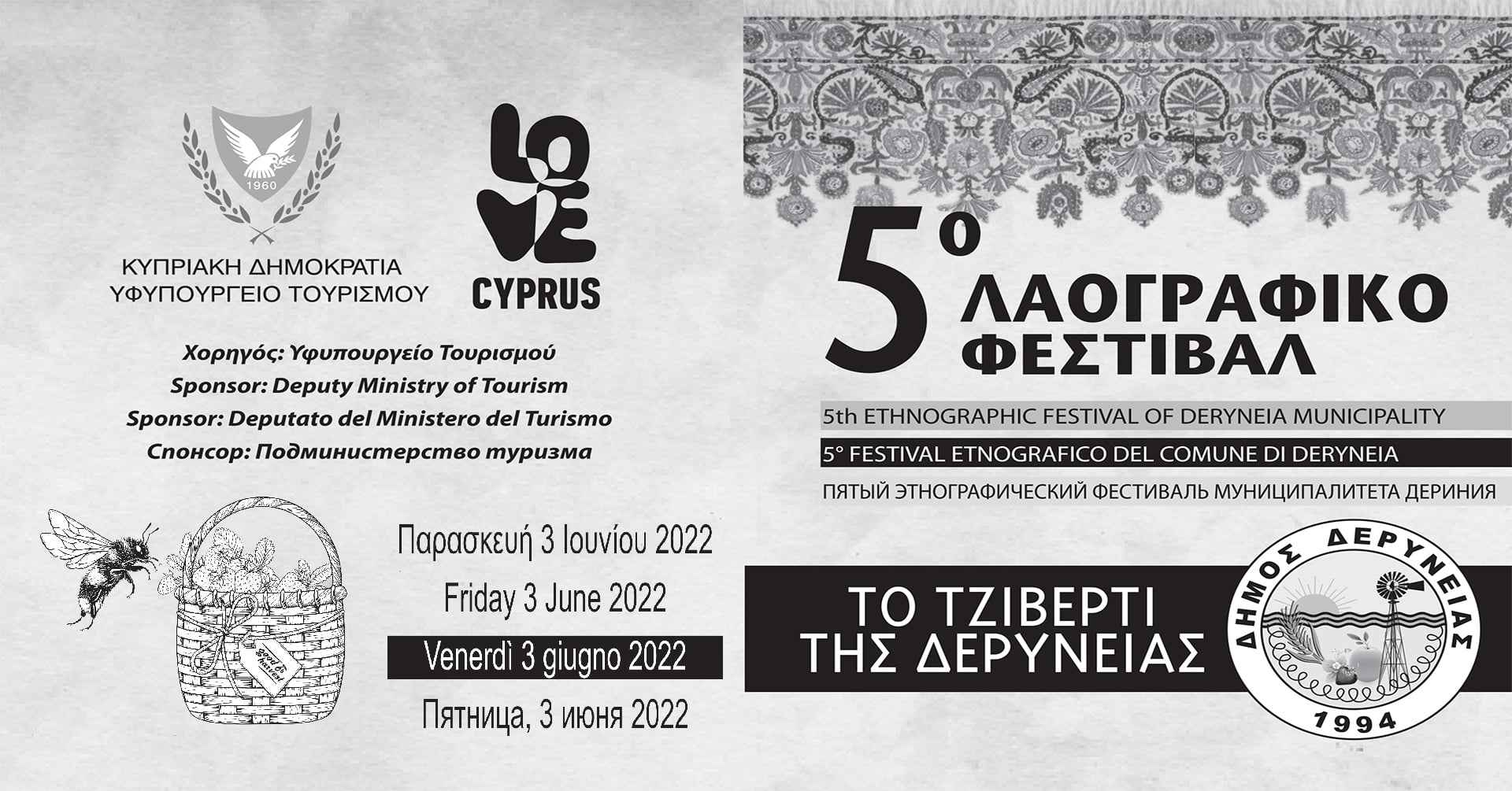 Ο Δήμαρχος, το Δημοτικό Συμβούλιο και η Επιτροπή Πολιτισμού του Δήμου Δερύνειας, σας προσκαλούν να τιμήσετε με την παρουσία σας το 5ο Λαογραφικό Φεστιβάλ Δερύνειας.