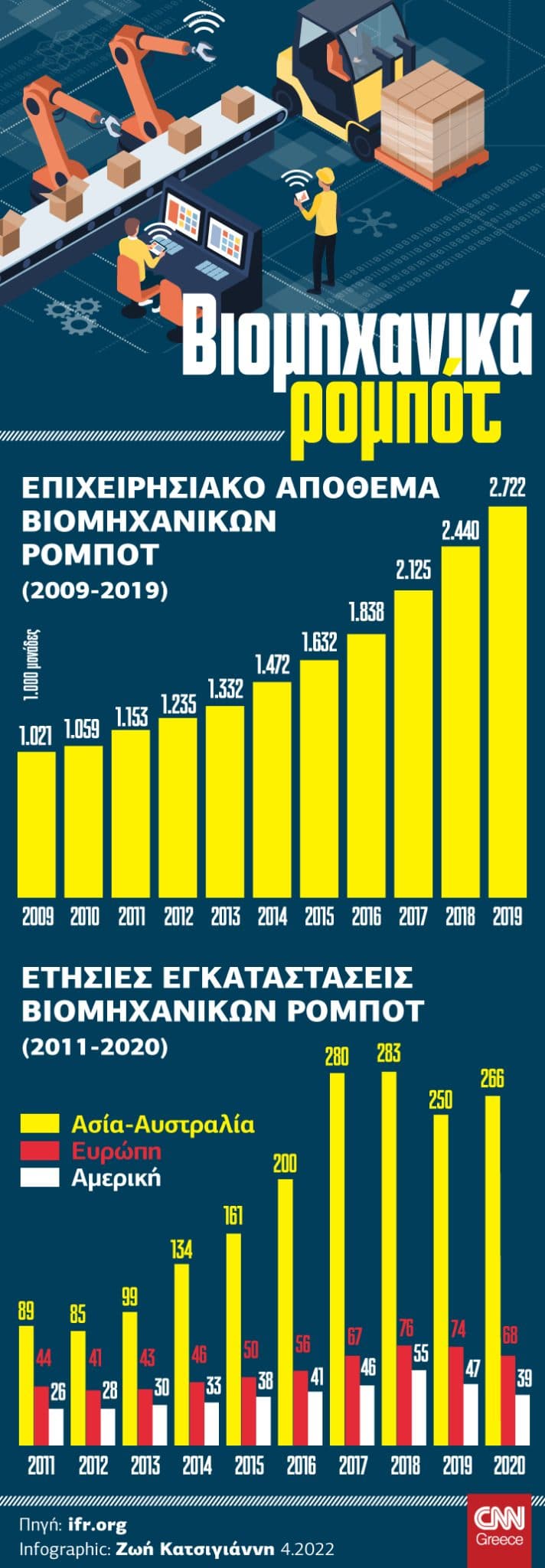 Τα σύγχρονα ρομπότ είναι η επιτομή της νέας τεχνολογίας, της συνεχούς τεχνολογικής εξέλιξης στα συστήματα αυτοματισμού και της τεχνητής νοημοσύνης. Τα τελευταία χρόνια, η αλματώδης ψηφιακή και τεχνολογική εξέλιξη και οι νέες δυνατότητες, που έχουν ενσωματωθεί στις λειτουργίες τους, έχουν οδηγήσει σε διαρκώς αυξανόμενη χρήση τους στο παραγωγικό περιβάλλον, με σημαντικές αλλαγές και ως προς το περιεχόμενο, αλλά και ως προς την οργάνωση της εργασίας και τις εργασιακές σχέσεις σε διεθνές επίπεδο. Με την τεχνολογική εξέλιξη και την 4η βιομηχανική επανάσταση, λοιπόν, να αλλάζει τον κόσμο ταχύτατα, ως κοινωνία και ως οικονομία, καλούμαστε να πάρουμε θέση για το πώς θα αντιμετωπίσουμε τις προκλήσεις που έχουμε μπροστά μας, αλλά και το πώς θα επωφεληθούμε από τα οφέλη του νέου παραγωγικού περιβάλλοντος που απλώνεται μπροστά μας.