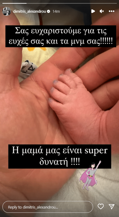 Συγκεκριμένα, ο Δημήτρης Αλεξάνδρου, μοιράστηκε μαζί μας, την πρώτη φωτογραφία του νεογέννητου γιου του, στην οποία βλέπουμε το πατουσάκι του, με τον ίδιο να σχολιάζει τα ακόλουθα: “Σας ευχαριστούμε για τις ευχές σας και τα μηνύματά σας. Η μαμά μας είναι super δυνατή”.