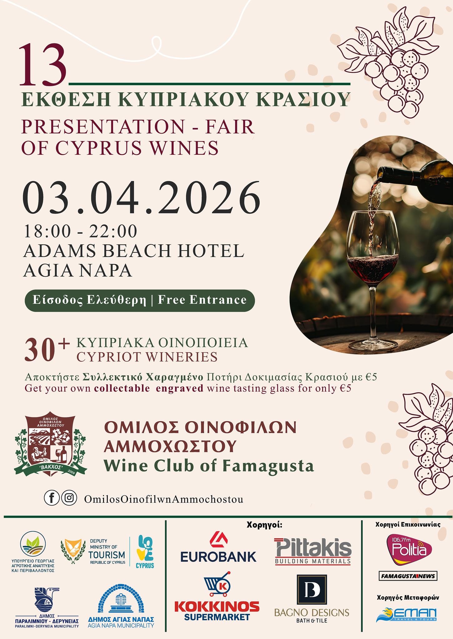 Η 13η Έκθεση Κυπριακού Κρασιού επιστρέφει φέτος στην Αγία Νάπα, προσκαλώντας το κοινό σε μια ξεχωριστή εμπειρία αφιερωμένη στον κυπριακό αμπελώνα και την οινική παράδοση του νησιού. Η εκδήλωση θα πραγματοποιηθεί στις 3 Απριλίου 2026, από τις 18:00 έως τις 22:00, στο Adams Beach Hotel.