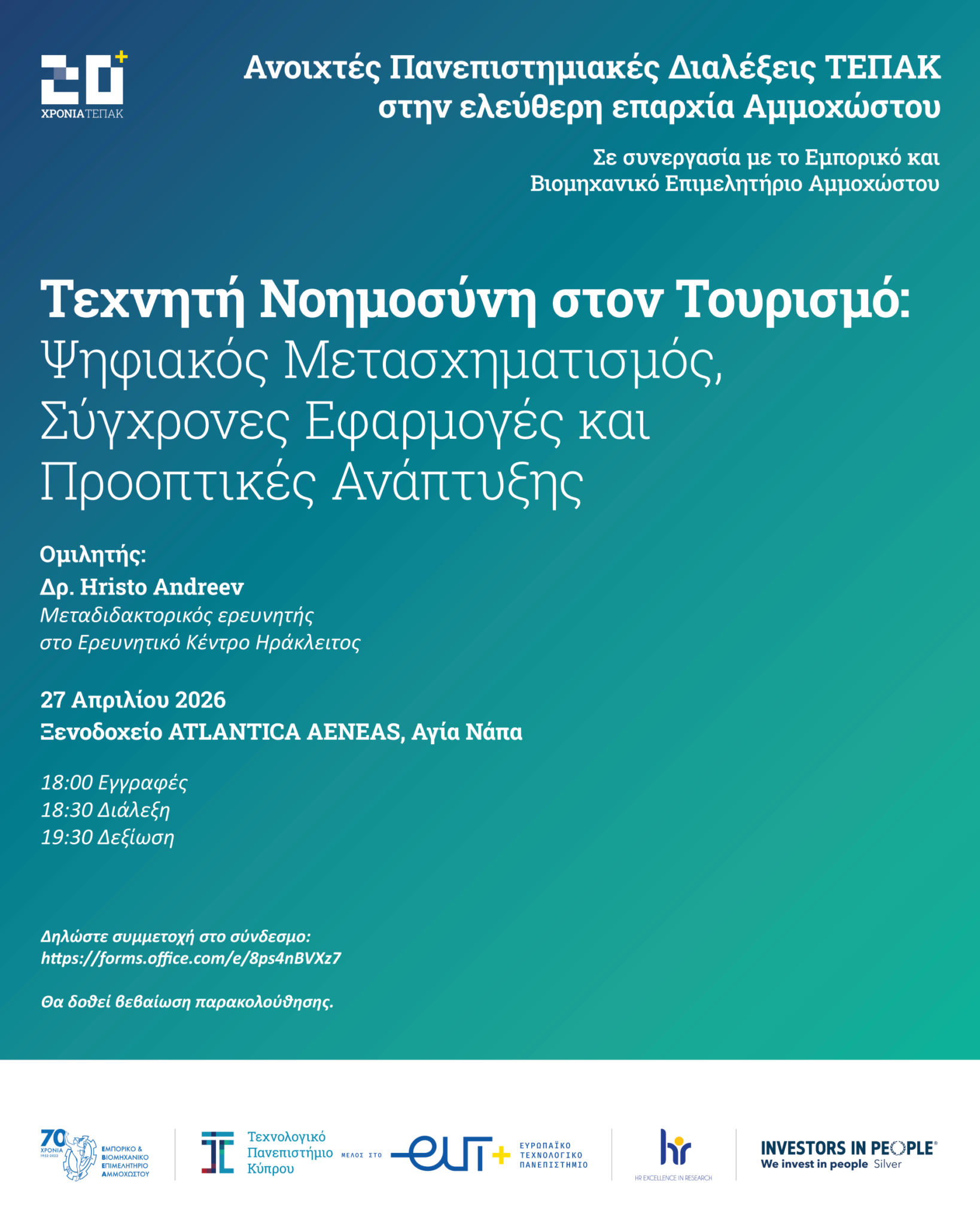 Διάλεξη με τίτλο «Τεχνητή Νοημοσύνη στον Τουρισμό: Ψηφιακός Μετασχηματισμός, Σύγχρονες Εφαρμογές και Προοπτικές Ανάπτυξης» θα πραγματοποιηθεί τη Δευτέρα 27 Απριλίου 2026 και ώρα 18:30 στο ξενοδοχείο ATLANTICA AENEAS στην Αγία Νάπα.