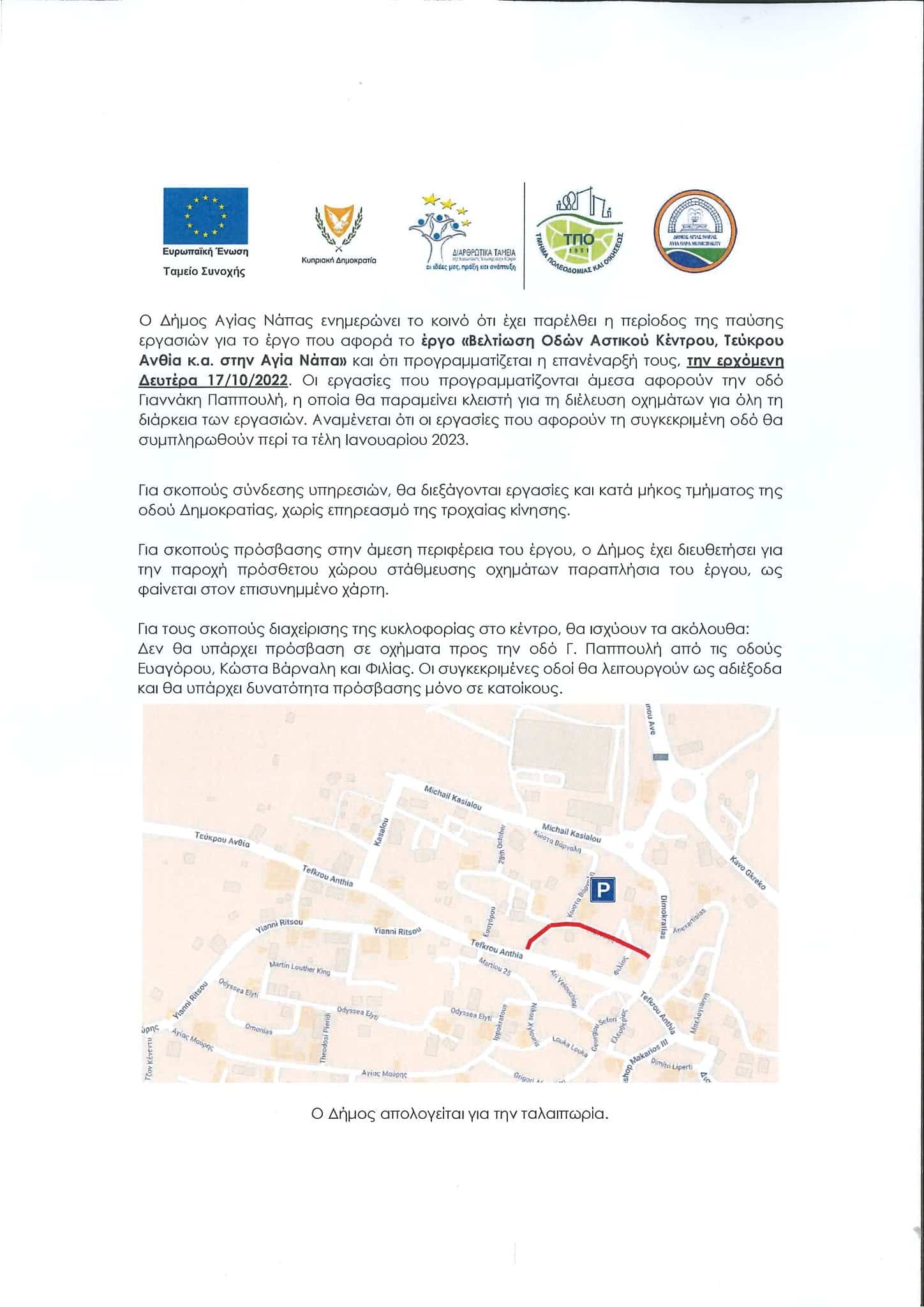 Ο Δήμος Αγίας Νάπας ενημερώνει το κοινό ότι έχει παρέλθει η περίοδος της παύσης εργασιών για το έργο που αφορά το έργο: “Βελτίωση οδών αστικού κέντρου, Τεύκρου Ανθία και άλλα στην Αγία Νάπα.