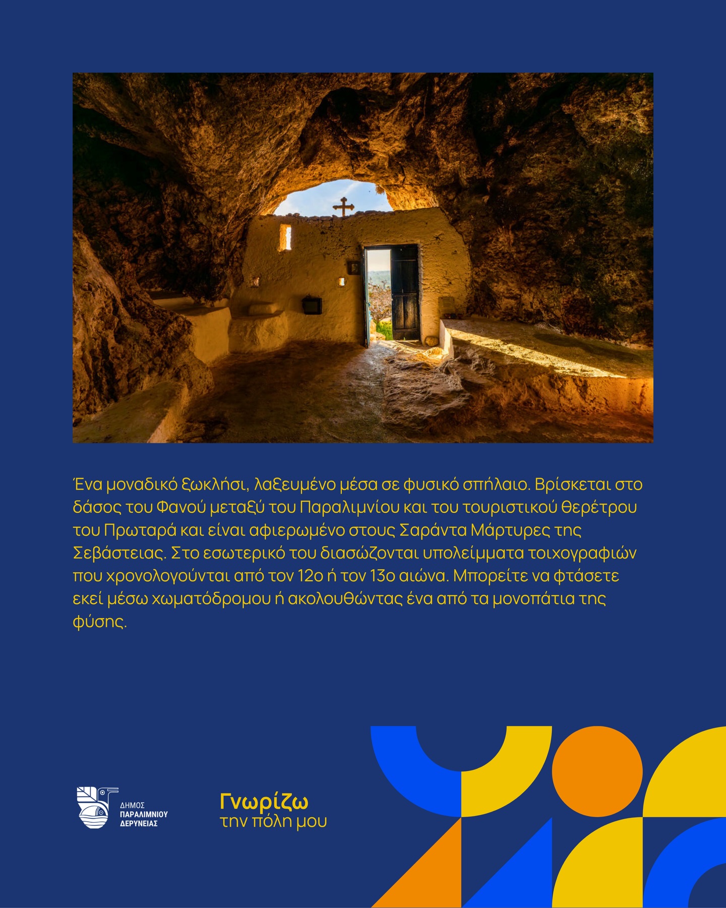 Ένα μοναδικό ξωκλήσι, λαξευμένο μέσα σε φυσικό σπήλαιο. Βρίσκεται στο δάσος του Φανού μεταξύ του Παραλιμνίου και του τουριστικού θερέτρου του Πρωταρά και είναι αφιερωμένο στους Σαράντα Μάρτυρες της Σεβάστειας.