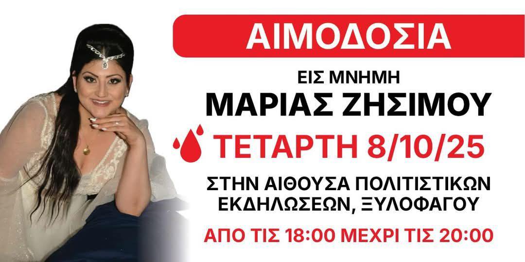 Το Κοινοτικό Συμβούλιο Ξυλοφάγου σας προσκαλεί να τιμήσουμε τη μνήμη της Μαρίας Ζησίμου μέσα από μια πράξη αγάπης και προσφοράς προς τον συνάνθρωπο την Τετάρτη 8 Οκτωβρίου 2025 στην Αίθουσα Πολιτιστικών Εκδηλώσεων, Ξυλοφάγου από τις 18:00 μέχρι τις 20:00