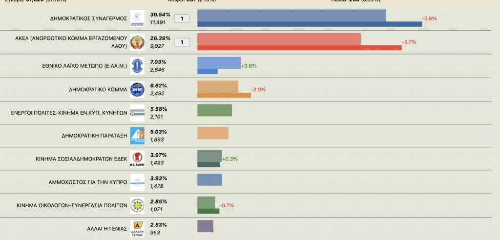 Ενώ η καταμέτρηση των ψήφων είναι ακόμη στο 45.5%, την πρώτη θέση καταλαμβάνει ο ΔΗΣΥ ενώ δεύτερο ακολουθεί το ΑΚΕΛ.