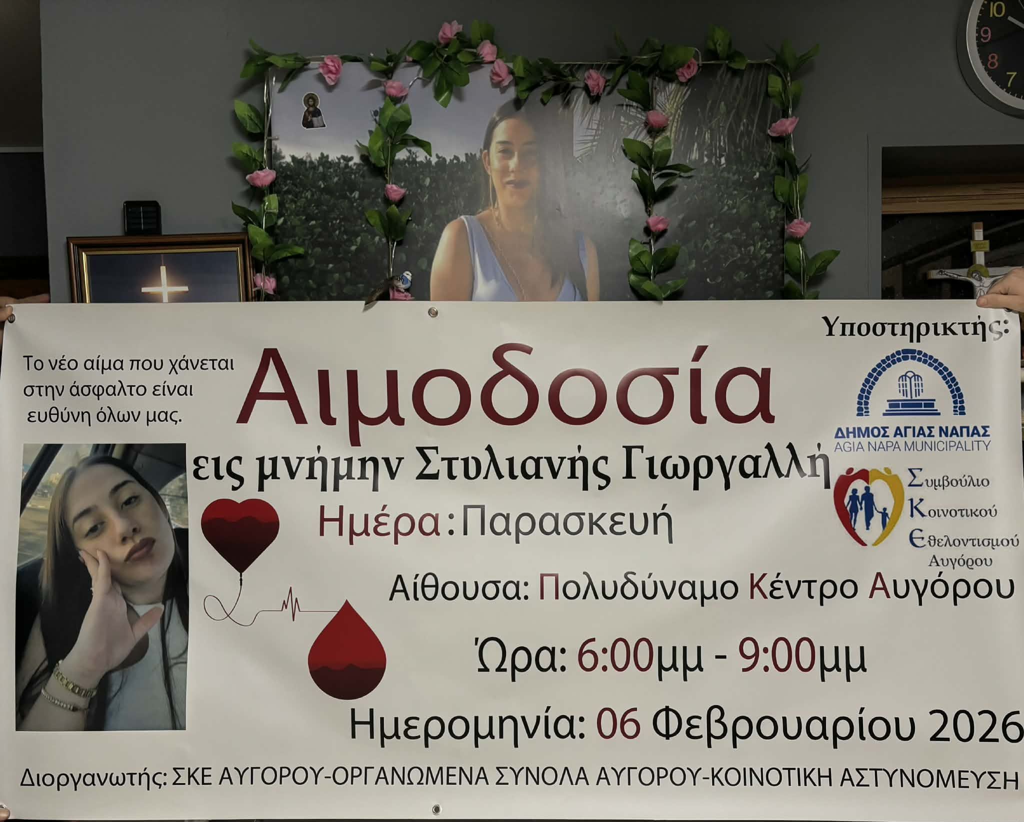 Αιμοδοσία αφιερωμένη στην Στυλιανή Γιωργαλλή διοργανώνεται την Παρασκευή 06/02/26 στο πολυδύναμο κέντρο Αυγόρου από τις 6:00-9:00μ.μ.