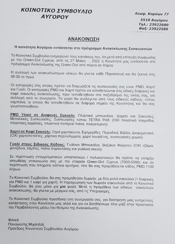 Η ανακύκλωση θα γίνεται κάθε Παρασκευή ενώ το Κοινοτικό Συμβούλιο θα προμηθεύσει δωρεάν για μία φορά, 2 ρολά σακούλια (χαρτί & PMD).