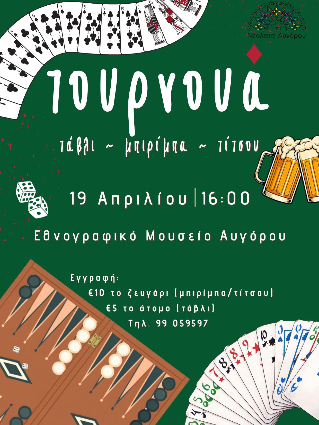 Η Νεολαία Αυγόρου διοργανώνει τουρνουά την Κυριακή 19 Απριλίου στις 16:00 στο Εθνογραφικό Μουσείο Αυγόρου.