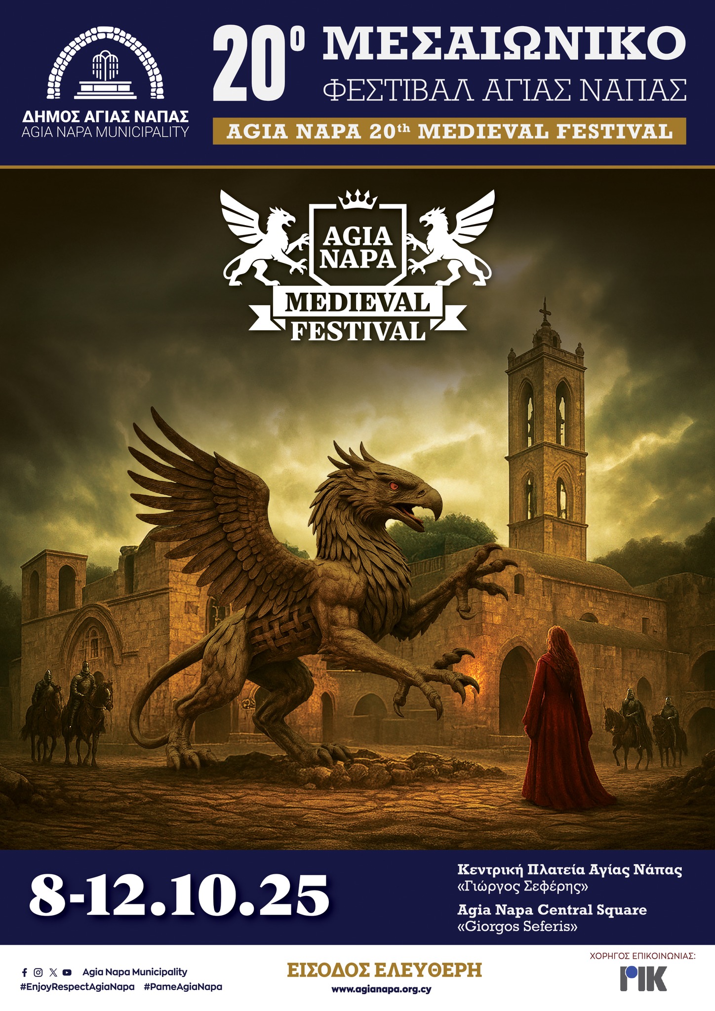 Η Αγία Νάπα φορά τα μεσαιωνικά της και γιορτάζει την επέτειο των 20 χρόνων του μεγαλύτερου και καταξιωμένου πολιτιστικού θεσμού της. Το Μεσαιωνικό Φεστιβάλ Αγίας Νάπας επιστρέφει από τις 8 έως τις 12 Οκτωβρίου 2025, με ένα ανανεωμένο πρόγραμμα που φέρνει πιο κοντά από ποτέ τον κόσμο του Μεσαίωνα.