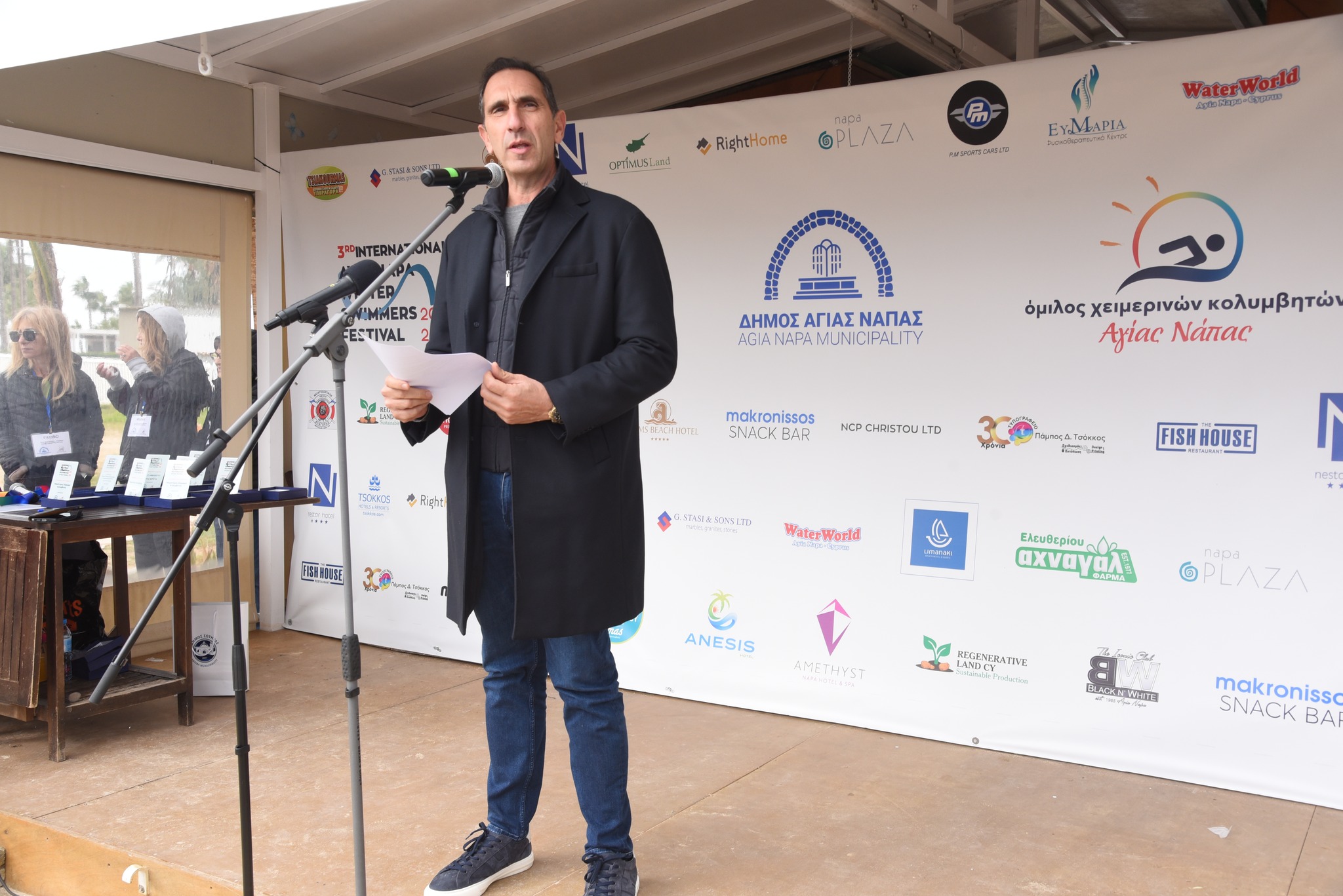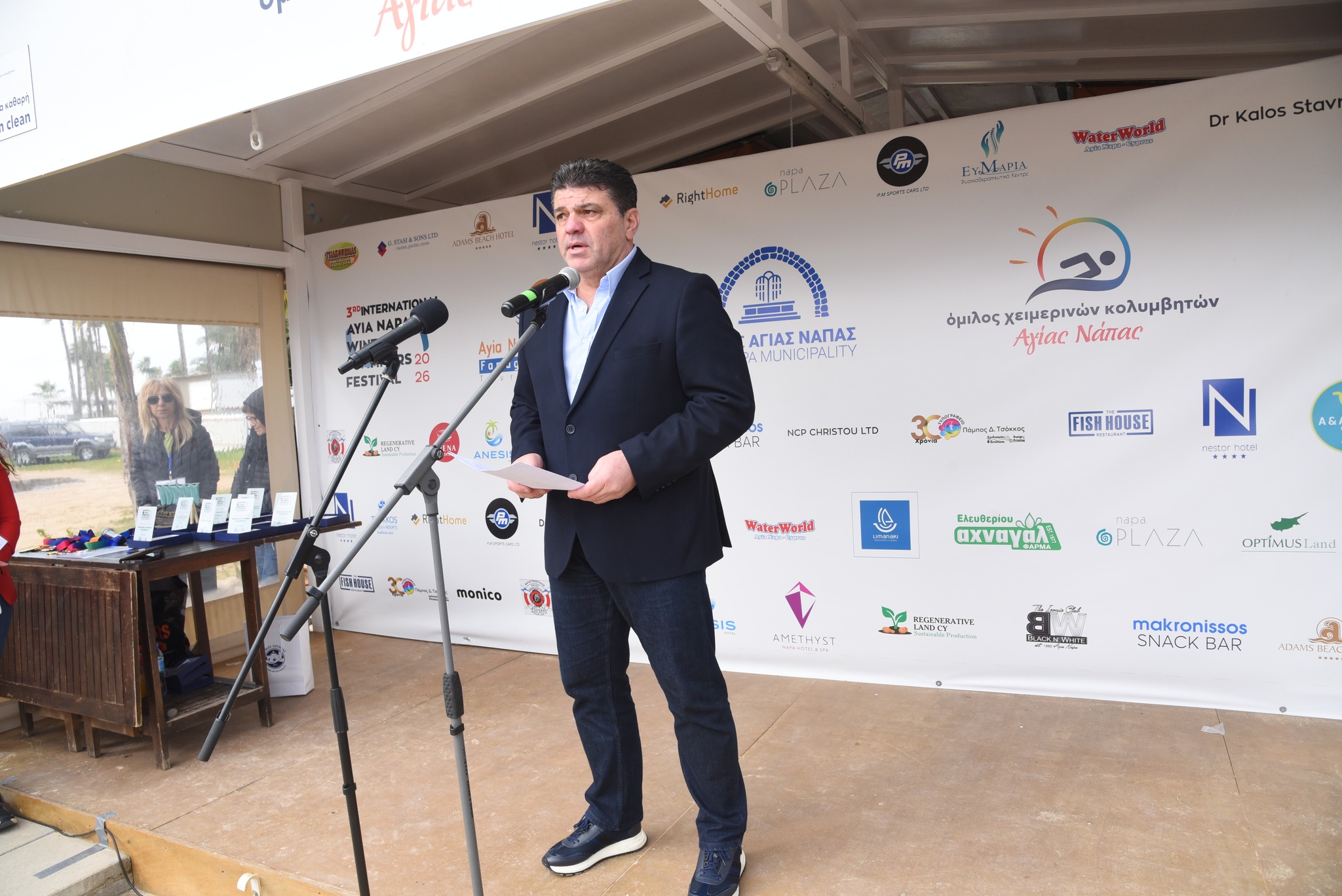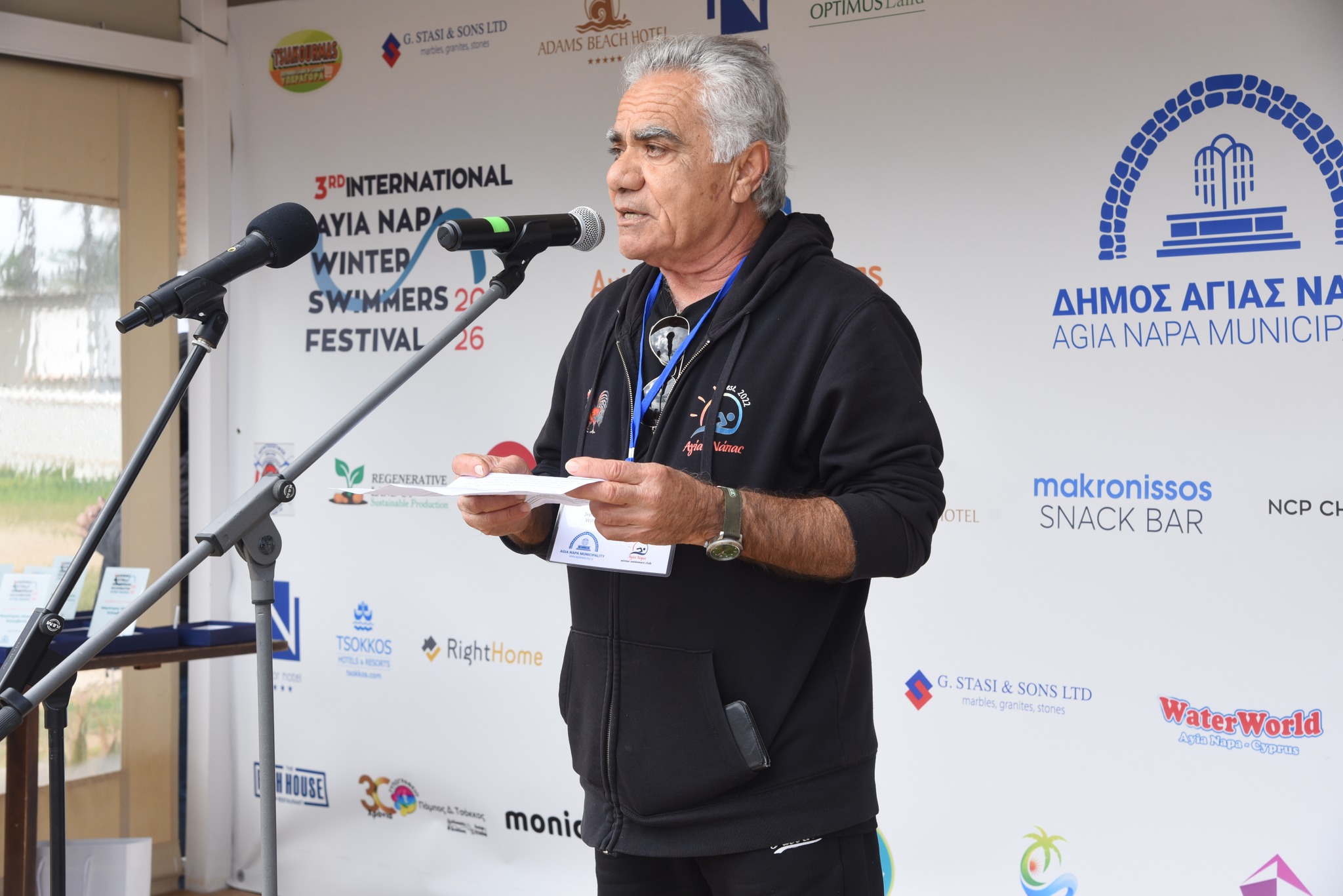 Ο Δήμαρχος Αγίας Νάπας κ. Χρίστος Ζαννέττου, στον χαιρετισμό του, τόνισε τη σημασία του Φεστιβάλ ως θεσμού που προάγει τον αθλητισμό, την ευεξία και τον σεβασμό προς το θαλάσσιο περιβάλλον. Υπογράμμισε τη στήριξη της Πολιτείας μέσω της παρουσίας του Υπουργού Εσωτερικών και ανέδειξε τη χειμερινή κολύμβηση ως φιλοσοφία ζωής που καλλιεργεί την ανθεκτικότητα και την περιβαλλοντική συνείδηση.