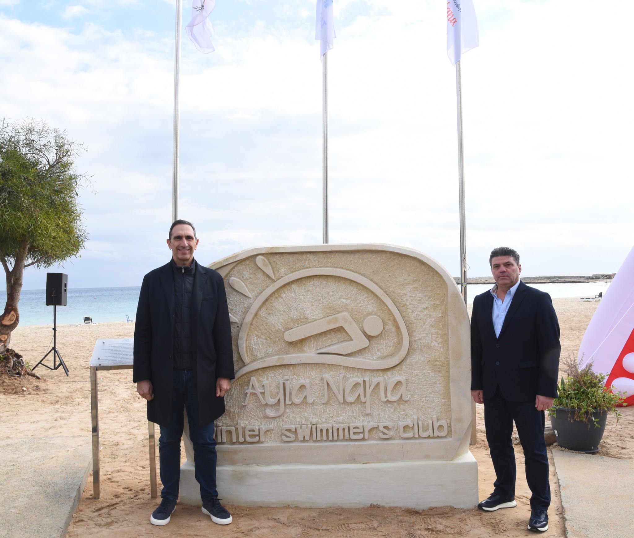 Μετά το πέρας των απονομών, ο Δήμαρχος Αγίας Νάπας κ. Χρίστος Ζαννέττου, μαζί με τον Υπουργό Εσωτερικών κ. Κωνσταντίνο Ιωάννου και συνοδευόμενοι από τους Αντιδημάρχους, τον Πρόεδρο και τα Μέλη του Ομίλου Χειμερινών Κολυμβητών Αγίας Νάπας, προχώρησαν στα αποκαλυπτήρια του ανάγλυφου εμβλήματος του Ομίλου. Πρόκειται για μια ξεχωριστή στιγμή που σηματοδοτεί τη δυναμική και διαχρονική παρουσία του Ομίλου στην παραλία «Μακρόνησος».