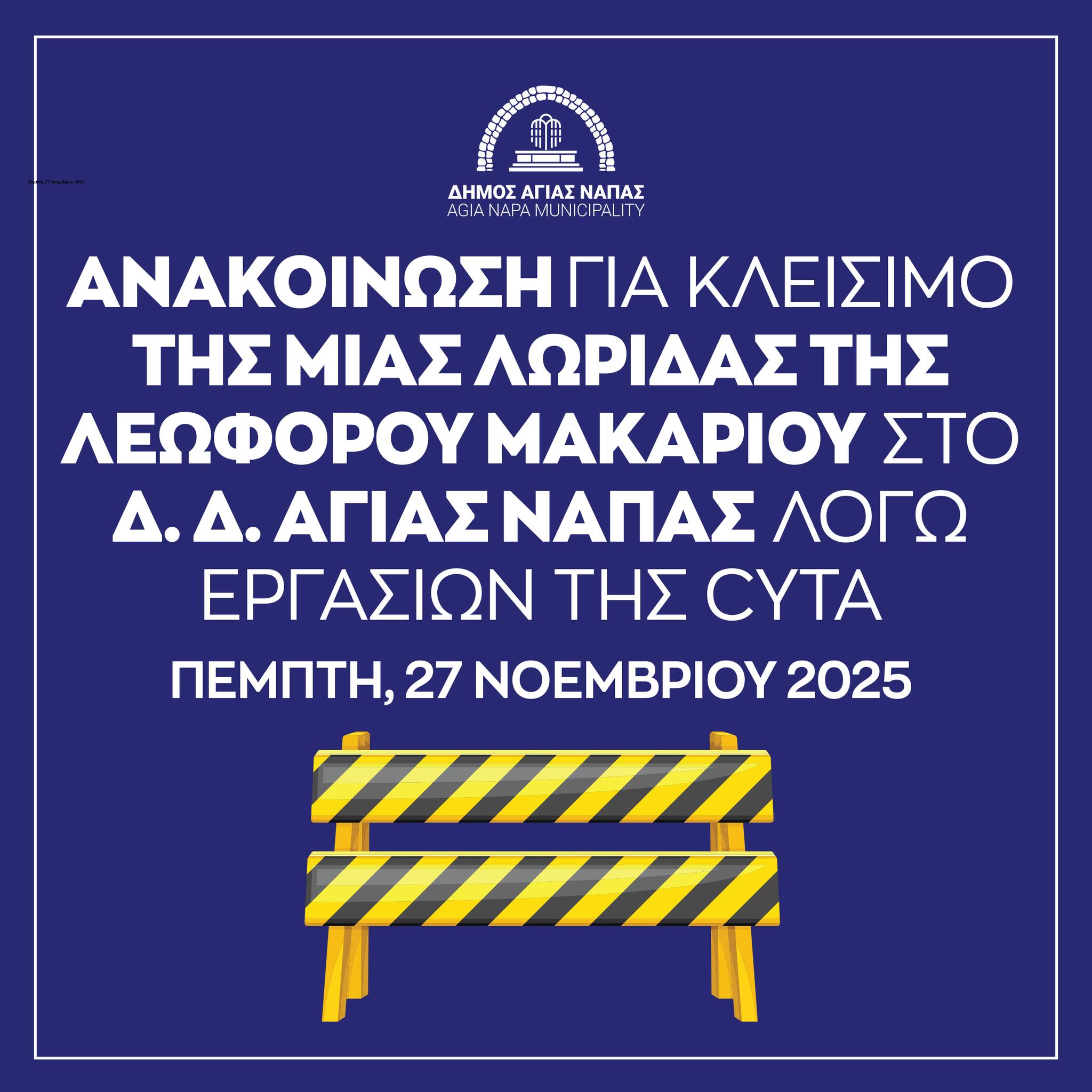 Ο Δήμος Αγίας Νάπας πληροφορεί το κοινό ότι την Πέμπτη, 27 Νοεμβρίου 2025, η Cyta θα προβεί σε εργασίες αφαίρεσης χάλκινου δικτύου και αντικατάστασης φθαρμένου καπακιού τύπου ΦΕ, Ε0 στην λεωφόρο Μακαρίου, στο Δημοτικό Διαμέρισμα Αγίας Νάπας.
