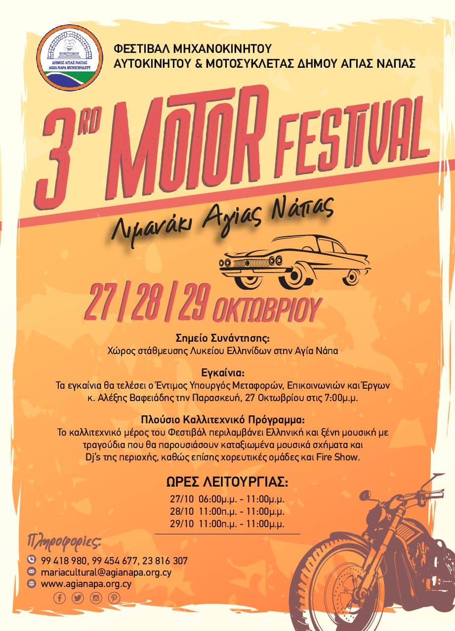 Μετά τη μεγάλη επιτυχία που σημείωσε η Έκθεση τις δύο προηγούμενες χρονιές, ο Δήμος Αγίας Νάπας διοργανώνει την 3η Έκθεση Μηχανοκίνητου Αυτοκινήτου και Μοτοσικλέτας από την Παρασκευή 27/10 μέχρι και την Κυριακή 29/10/2023, η οποία θα πραγματοποιηθεί στο χώρο στάθμευσης του Λυκείου Ελληνίδων.