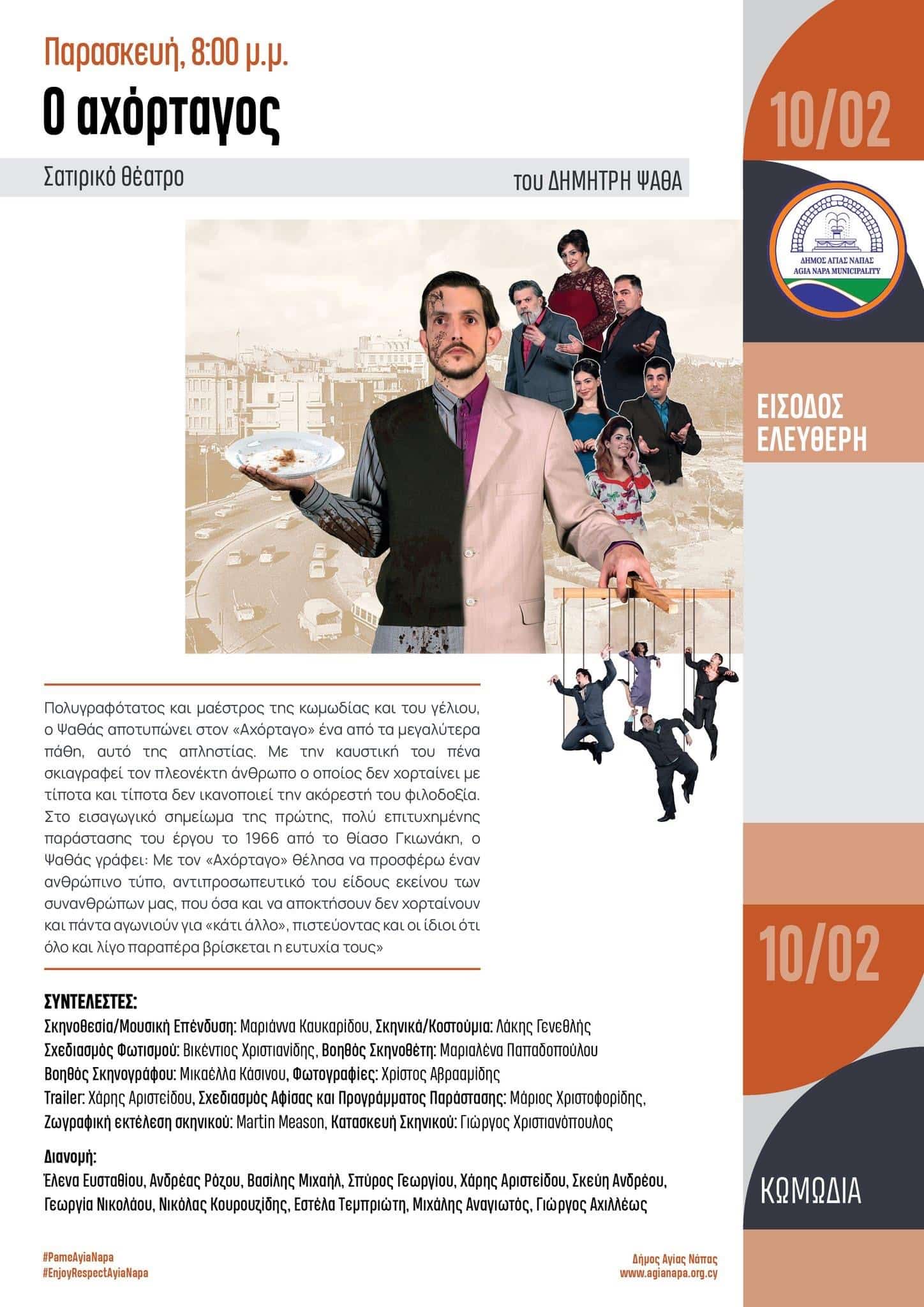“Ο αχόρταγος” του Δημήτρη Ψαθά από το Σατιρικό Θέατρο, στο πλαίσιο του Τρίμηνου Θεατρικού Παραστάσεων του Δήμου Αγίας Νάπας. Παρασκευή 10/2 στις 8:00 μ.μ. στο Δημοτικό Θέατρο Αγίας Νάπας. Είσοδος Ελεύθερη!