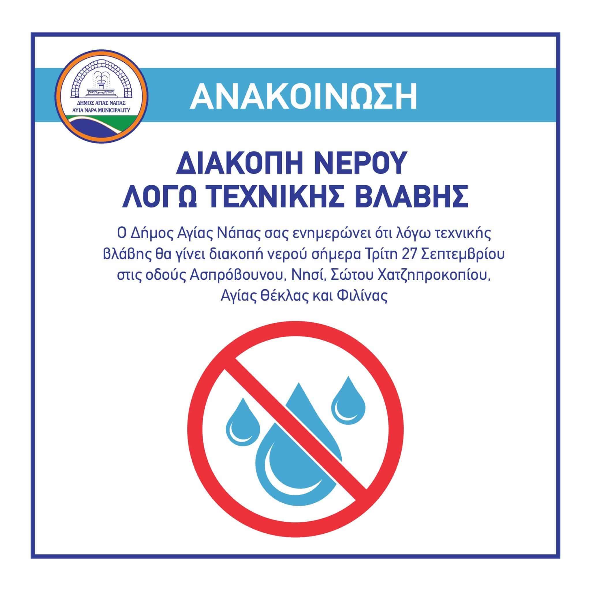Ο Δήμος Αγίας Νάπας ενημερώνει ότι λόγω τεχνικής βλάβης θα γίνει διακοπή νερού σήμερα Τρίτη 27 Σεπτεμβρίου στις οδούς Ασπρόβουνου, Νησί, Σώτου Χατζηπροκοπίου, Αγίας Θέκλας και Φιλίνας.