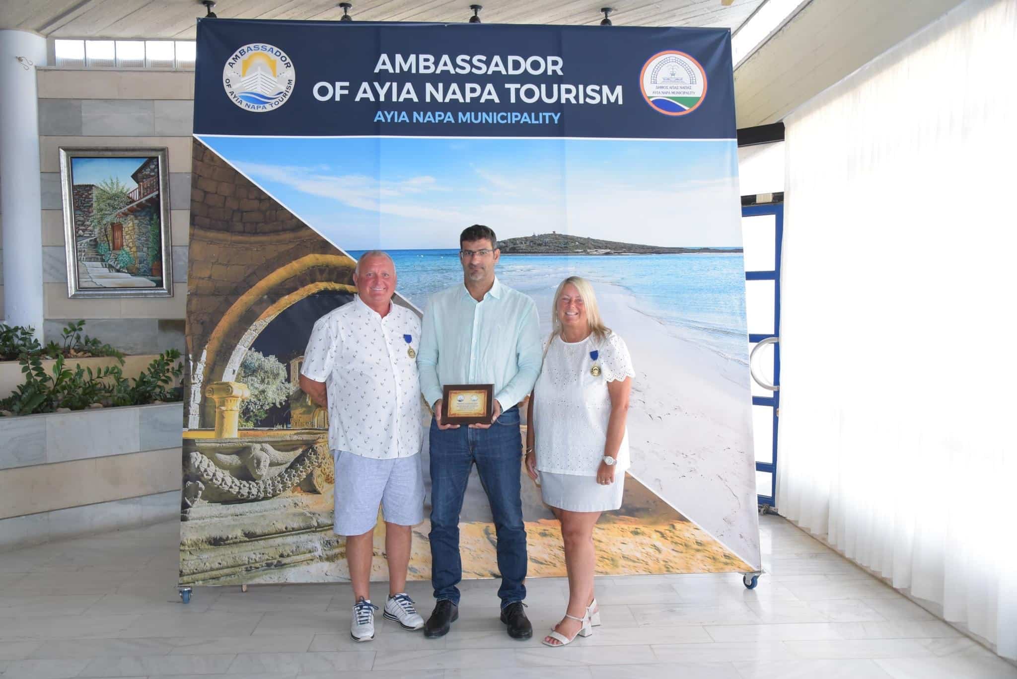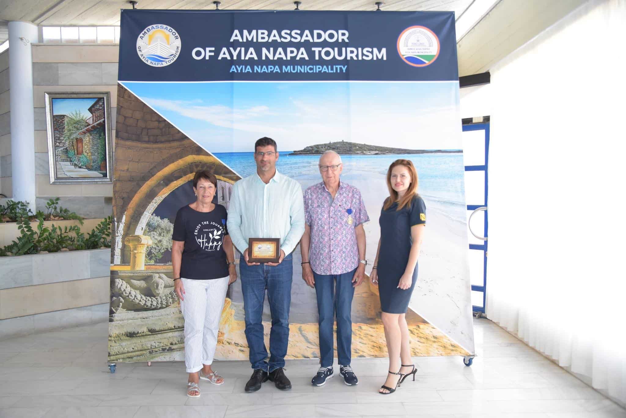 Απονέμοντάς τους την αναμνηστική πλακέτα και το έμβλημα του «Πρέσβη του Τουρισμού της Αγίας Νάπας» ο κ. Κίκιλλος τους ευχαρίστησε για τις πολυάριθμες επισκέψεις τους και εξήρε παράλληλα το σημαντικό ρόλο που διαδραματίζουν οι τακτικοί επισκέπτες όσο αφορά την προβολή του τουριστικού προϊόντος της περιοχής στο εξωτερικό, αφού όπως χαρακτηριστικά ανέφερε το πρεσβεύουν και το διαφημίζουν με τον καλύτερο και πειστικότερο τρόπο.