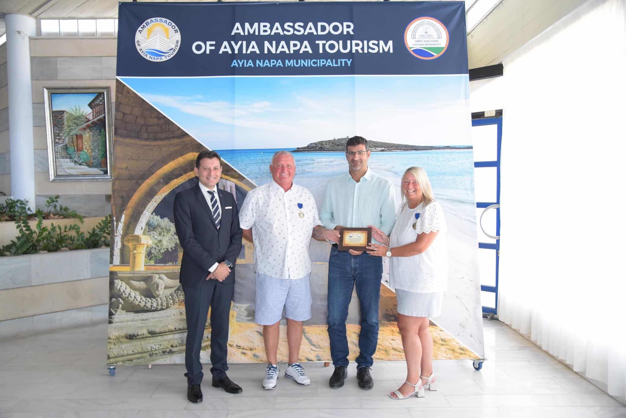 Δύο ζευγάρια τιμήθηκαν με το έμβλημα του «Πρέσβη του Τουρισμού» Αγίας Νάπας για τις 30 και 23 επισκέψεις τους .
