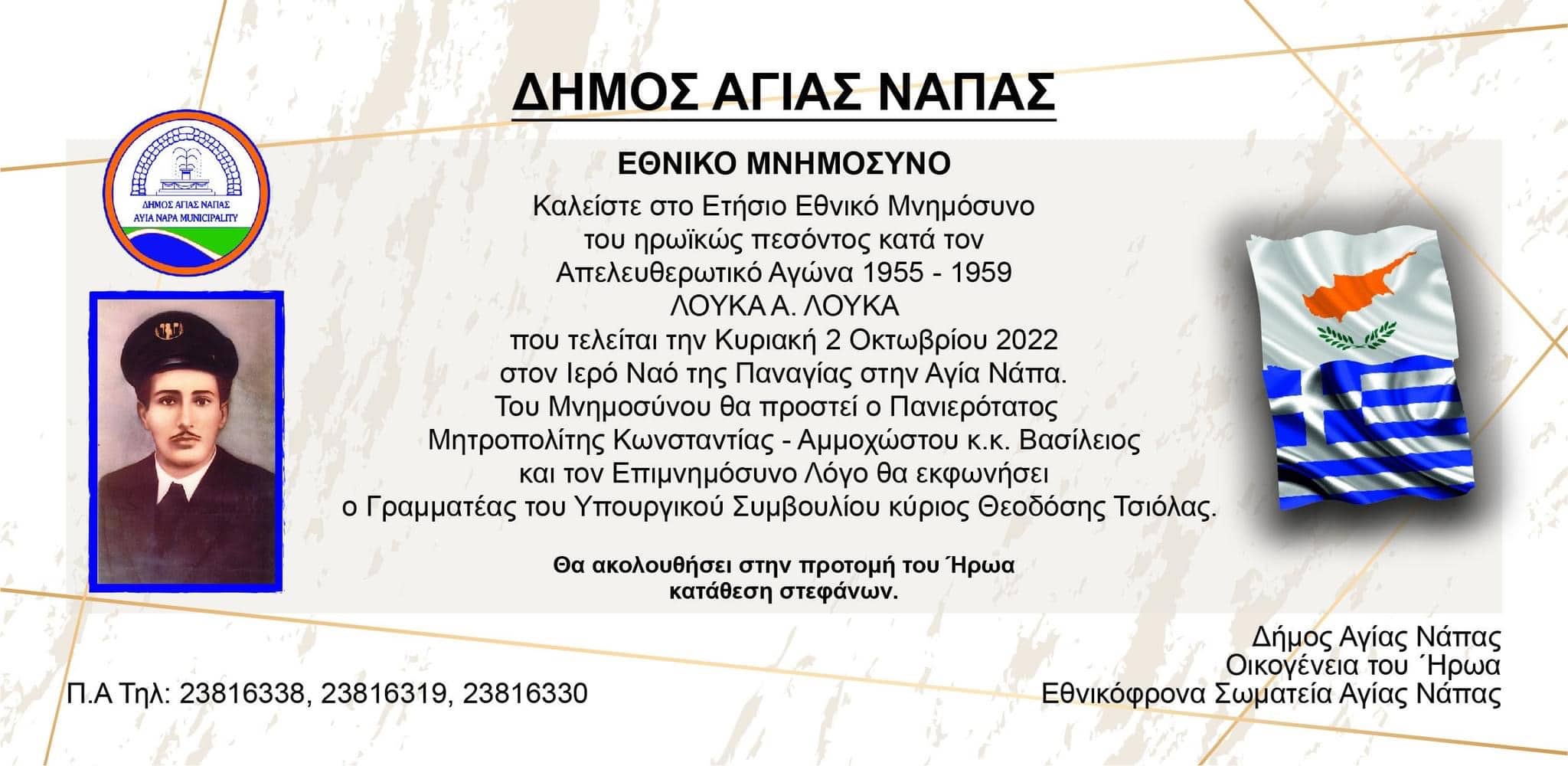 Τελείται την Κυριακή, 2 Οκτωβρίου 2022, στον Ιερό Ναό Παναγίας στην Αγία Νάπα, το Εθνικό Μνημόσυνο του ήρωα Λουκά Α Λουκά , που έπεσε ηρωικά μαχόμενος κατά τον απελευθερωτικό αγώνα 1955-1959.
