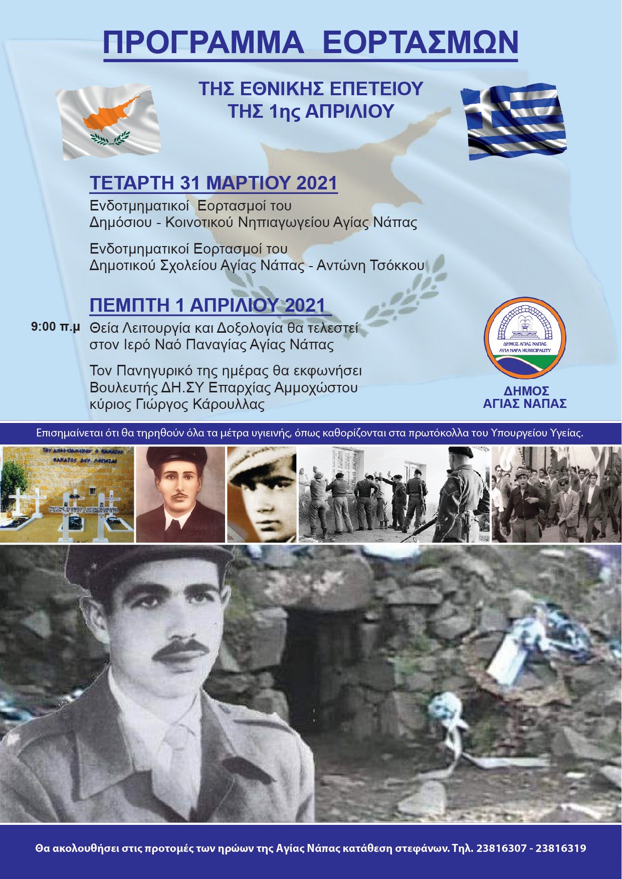 Την Τετάρτη 31 Μαρτίου θα πραγματοποιηθούν στα εκπαιδευτήρια της πόλης ενδοτμηματικοί ενώ ανήμερα της επετείου, την 1η Απριλίου, θα τελεστεί στον Ιερό Ναό Παναγίας Αγίας Νάπας, στις 9.00π.μ, δοξολογία.