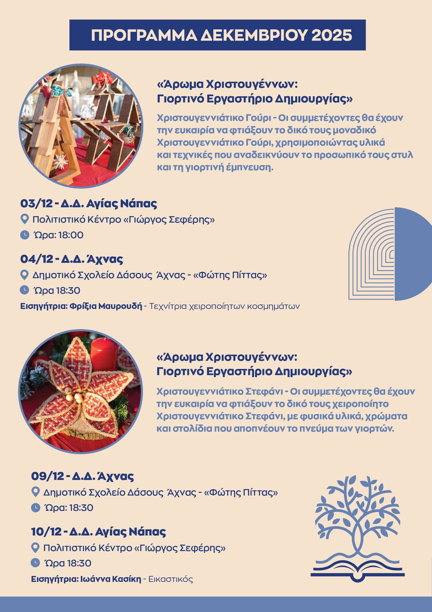 Μεταξύ των Δεκεμβριανών δράσεων, ξεχωρίζουν δύο δημιουργικά εργαστήρια υπό τον τίτλο «Άρωμα Χριστουγέννων: Γιορτινό Εργαστήριο Δημιουργίας». Το πρώτο εργαστήριο, αφιερωμένο στο Χριστουγεννιάτικο Γούρι, δίνει στους συμμετέχοντες τη δυνατότητα να κατασκευάσουν το δικό τους συμβολικό γούρι, επιλέγοντας υλικά και τεχνικές που εκφράζουν τη δημιουργικότητά τους και τη χαρά της χριστουγεννιάτικης περιόδου. Η δράση θα πραγματοποιηθεί την Τετάρτη, 03 Δεκεμβρίου στο Πολιτιστικό Κέντρο «Γιώργος Σεφέρης» στο Δημοτικό Διαμέρισμα Αγίας Νάπας στις 18:00 και την Πέμπτη 04 Δεκεμβρίου στο Δημοτικό Σχολείο Δάσους Άχνας «Φώτης Πίττας» στις 18:30, με εισηγήτρια τη Φρίξια Μαυρουδή, τεχνίτρια χειροποίητων κοσμημάτων.
