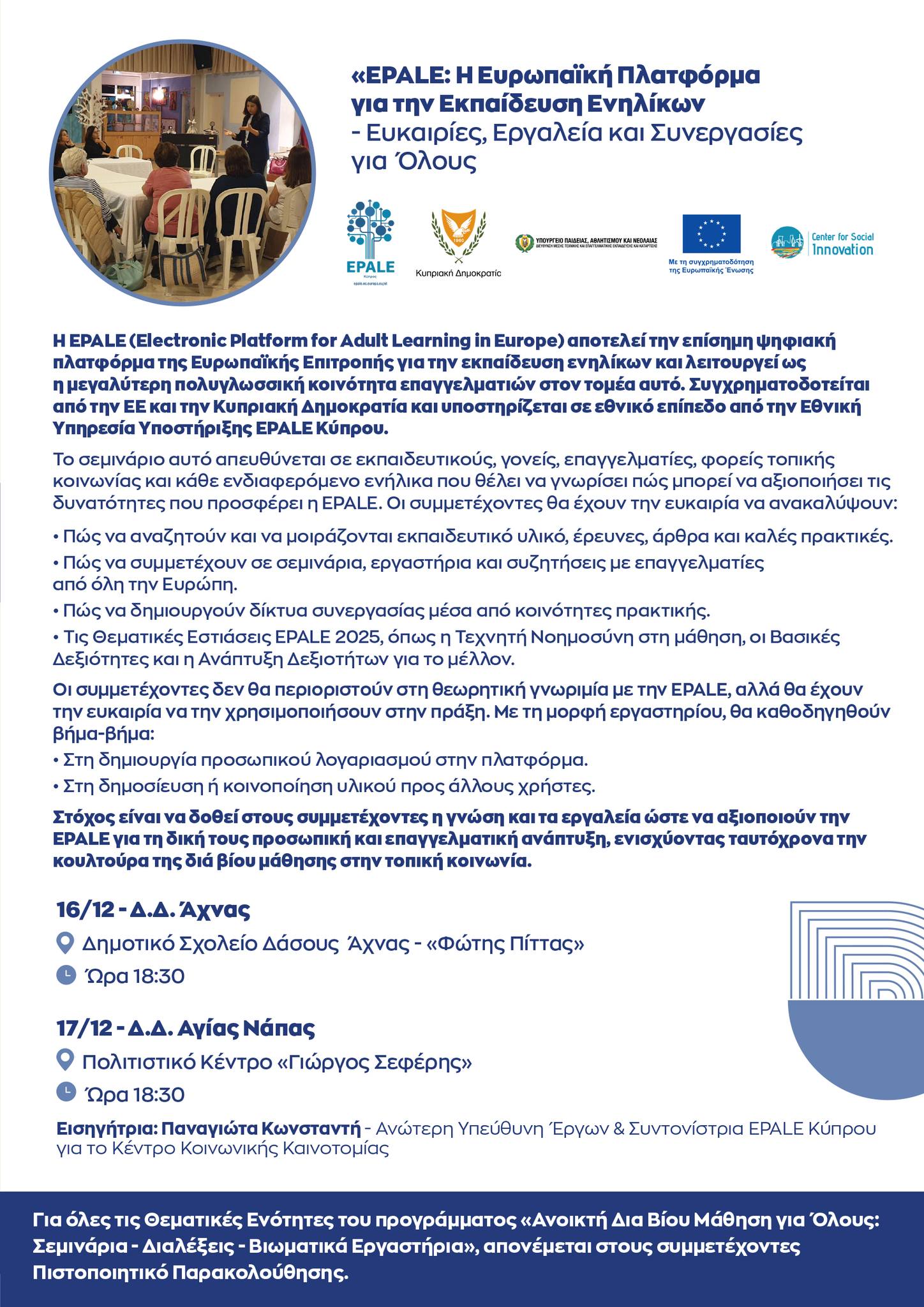 Επιπλέον, τον Δεκέμβριο διοργανώνεται το σεμινάριο «EPALE: Η Ευρωπαϊκή Πλατφόρμα για την Εκπαίδευση Ενηλίκων – Ευκαιρίες, Εργαλεία και Συνεργασίες για Όλους». Η EPALE (Electronic Platform for Adult Learning in Europe) αποτελεί την επίσημη ψηφιακή πλατφόρμα της Ευρωπαϊκής Επιτροπής για την εκπαίδευση ενηλίκων και λειτουργεί ως η μεγαλύτερη πολυγλωσσική κοινότητα επαγγελματιών στον τομέα αυτό.