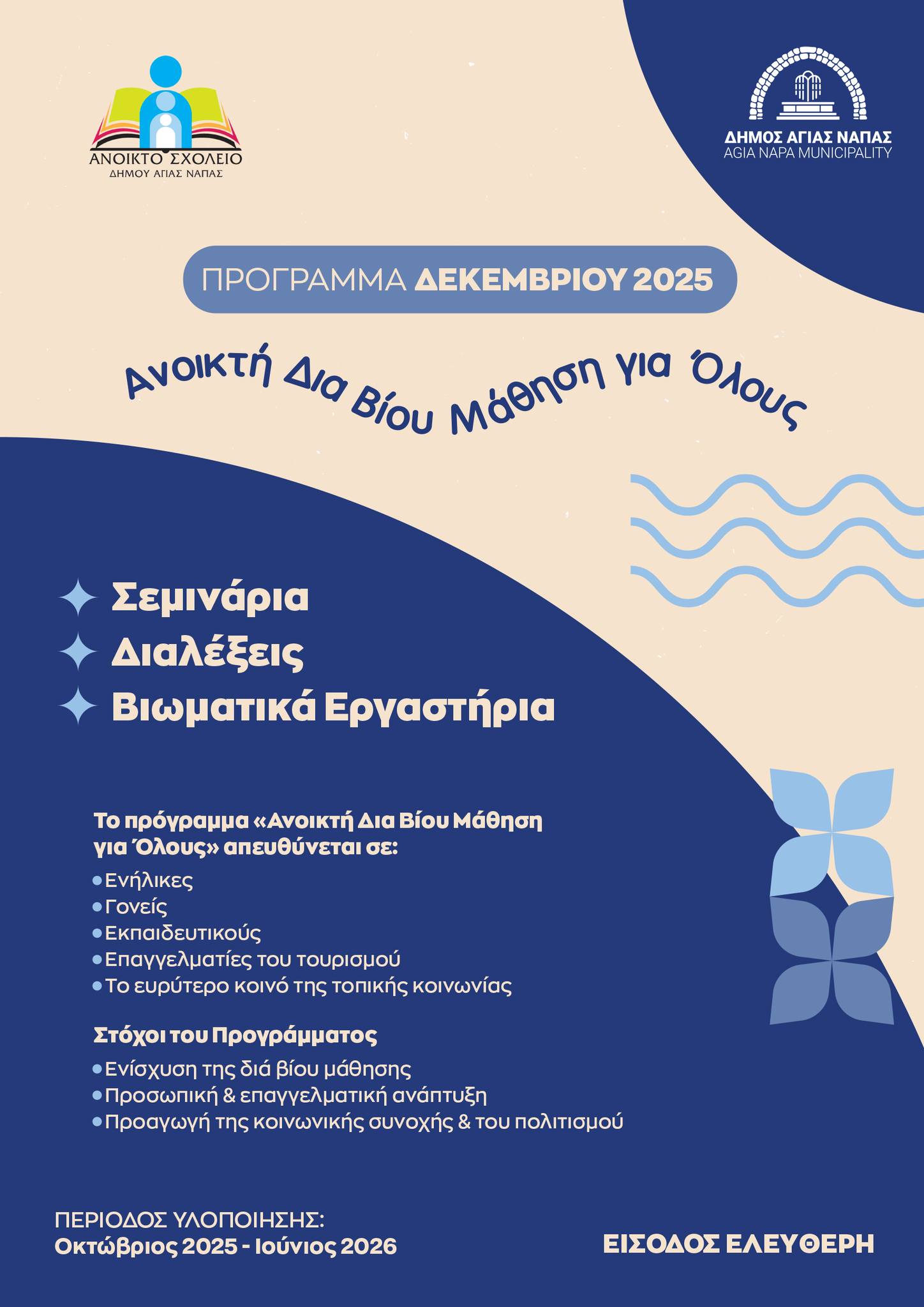 Το Ανοικτό Σχολείο Δήμου Αγίας Νάπας καλεί το κοινό να συμμετάσχει ενεργά στις δράσεις του Δεκεμβρίου, αξιοποιώντας την ευκαιρία για δημιουργία, μάθηση και γνώση.