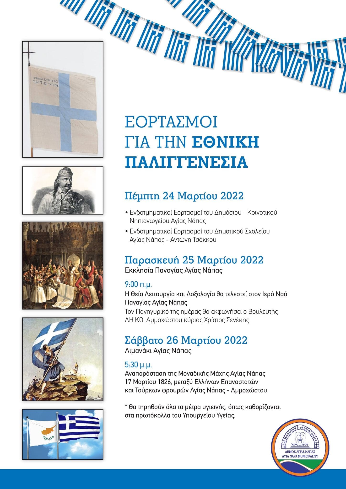 Με σημαιοστολισμούς και ενδοσχολικούς εορτασμούς η αρχή των εκδηλώσεων, οι οποίοι θα πραγματοποιηθούν στις 24 Μαρτίου 2022 στο Δημοτικό Σχολείο και στο Νηπιαγωγείο Αγίας Νάπας και με Πανηγυρική Δοξολογία ανήμερα της Εθνικής Επετείου, η οποία θα πραγματοποιηθεί στον Ιερό Ναό Παναγίας Νάπας, όπου τον πανηγυρικό της ημέρας θα εκφωνήσει ο Βουλευτής του ΔΗ.ΚΟ Αμμοχώστου κ. Χρίστος Σενέκης.