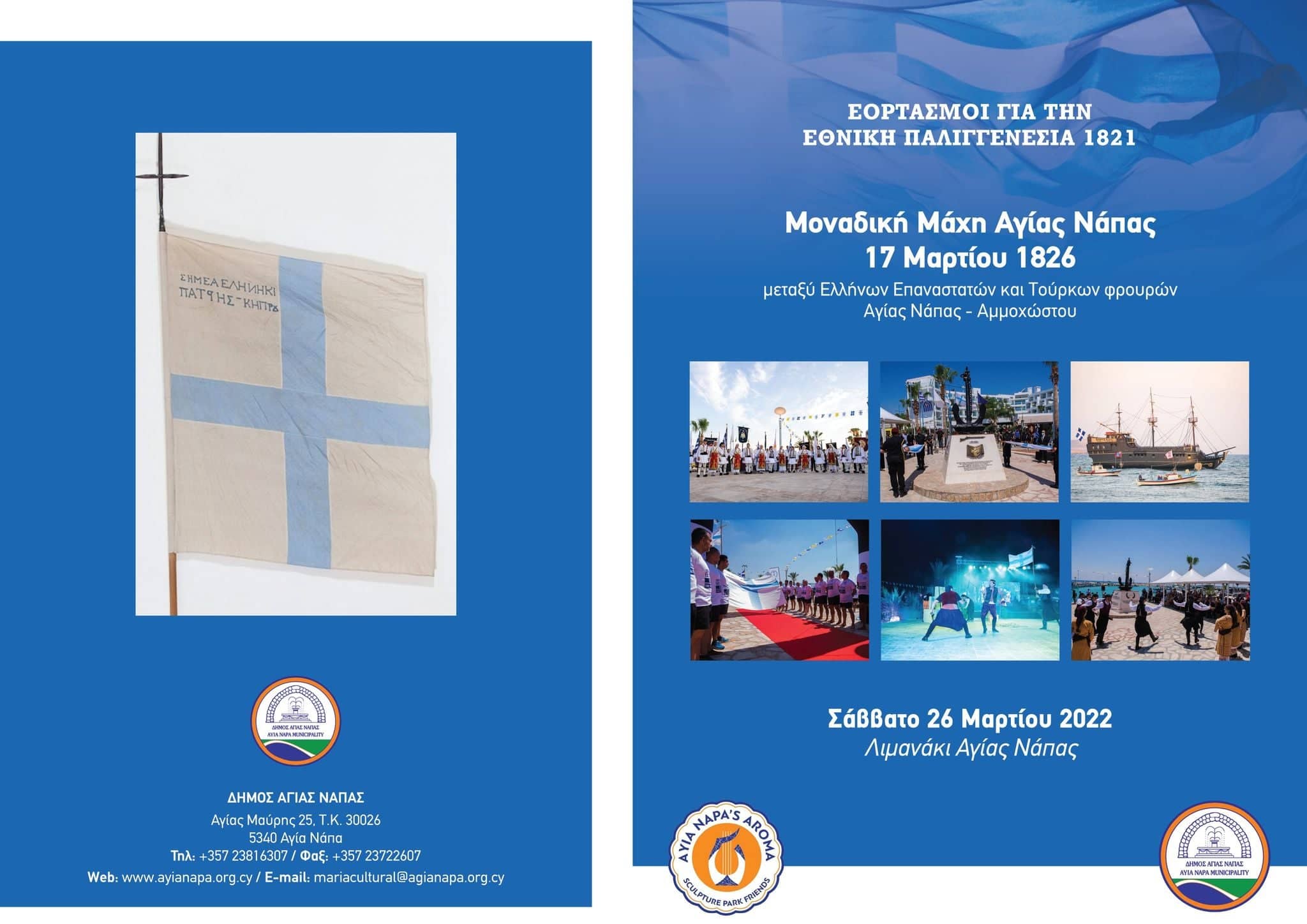 Οι Εορτασμοί θα ολοκληρωθούν με την μεγάλη εκδήλωση το Σάββατο 26 Μαρτίου στις 5:30μ.μ., στο Λιμανάκι Αγίας Νάπας. Η εκδήλωση διοργανώνεται σε συνεργασία με τον Σύνδεσμο Φίλοι Πάρκου Γλυπτικής «Άρωμα» Αγίας Νάπας, όπου θα γίνει η αναπαράσταση της μοναδικής μάχης που έλαβε χώρα στην Κύπρο μεταξύ Ελλήνων Επαναστατών και Τούρκων στρατιωτών της Κύπρου στην Αγία Νάπα, στις 17 Μαρτίου 1826.Θα τιμήσει με την παρουσία του ο Γραμματέας του Υπουργικού Συμβουλίου κ. Θεοδόσης Τσιόλας ο οποίος θα απευθύνει χαιρετισμό, όπως επίσης χαιρετισμό θα απευθύνουν ο Δήμαρχος Αγίας Νάπας κ. Χρίστος Ζαννέττου και ο Πρόεδρος του Συνδέσμου Φίλοι Πάρκου Γλυπτικής «΄Αρωμα» Αγίας Νάπας κ. Χριστάκης Πίττας.