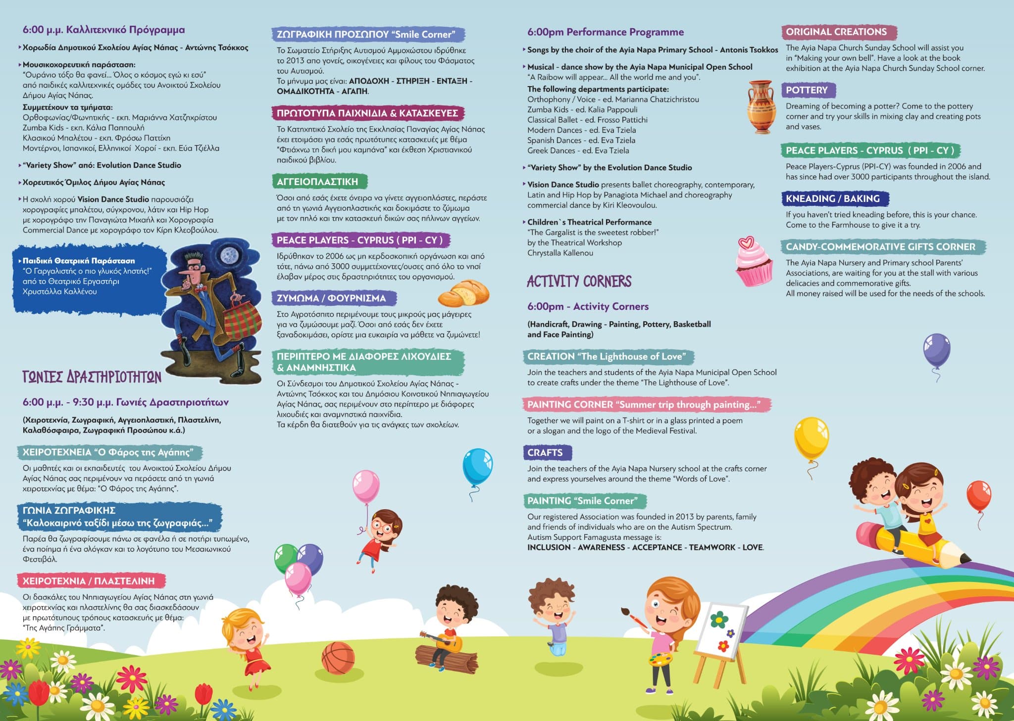 Περιλαμβάνει επίσης, πολλές γωνιές δραστηριοτήτων όπως Χειροτεχνία/Πλαστελίνη, Ζωγραφική/Αγιογραφία, Αγγειοπλαστική, Ζωγραφική Προσώπου, Ζύμωμα/Φούρνισμα, Καλαθόσφαιρα από τους Peace Players, πρωτότυπα παιγνίδια και κατασκευές, ενώ τα παιδιά θα έχουν επίσης την ευκαιρία να περάσουν όμορφες στιγμές με τις αγαπημένες Μασκότ από την ομάδα «Πολύχρωμη Διασκέδαση».