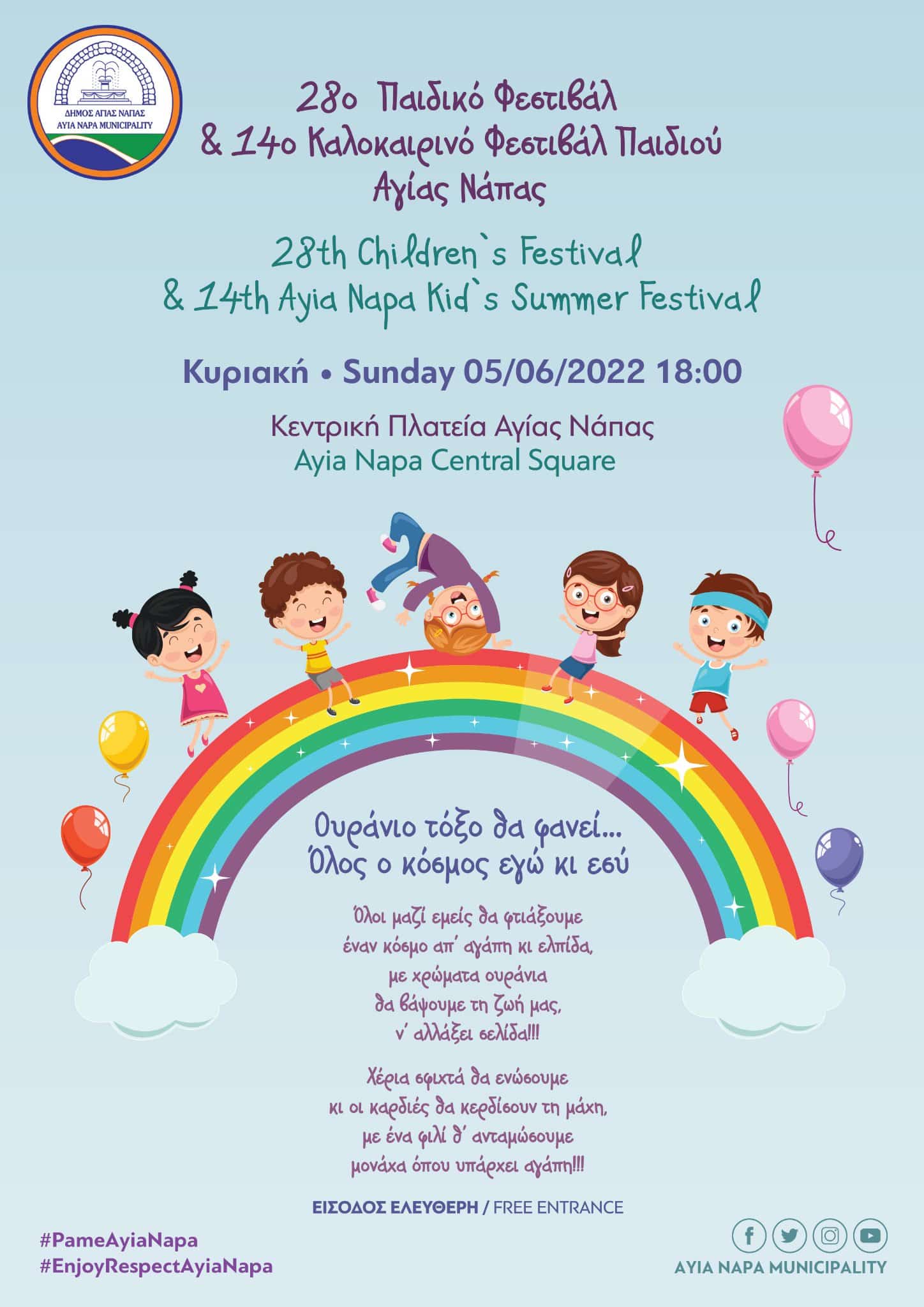 Μετά από δύο χρόνια αναγκαστικής ακύρωσης λόγω της Πανδημίας του Κορωνοϊού, το Παιδικό Φεστιβάλ και το Καλοκαιρινό Φεστιβάλ Παιδιού Αγίας Νάπας επιστρέφει ανανεωμένο, με πολλές εκπλήξεις και υπόσχεται να χαρίσει ένα φανταστικό Κυριακάτικο απόγευμα στους μικρούς μας φίλους. Το Φεστιβάλ διοργανώνεται από το Δήμο Αγίας Νάπας σε συνεργασία με τους Συνδέσμους Γονέων Δημοτικού και Νηπιαγωγείου Αγίας Νάπας, το εκπαιδευτικό προσωπικό Δημοτικού και Νηπιαγωγείου, τον Σύνδεσμο Αυτισμού Αμμοχώστου, Π.Ο.Π.Ο Αμμοχώστου, τα Κατηχητικά Σχολεία Παναγίας Αγίας Νάπας.
