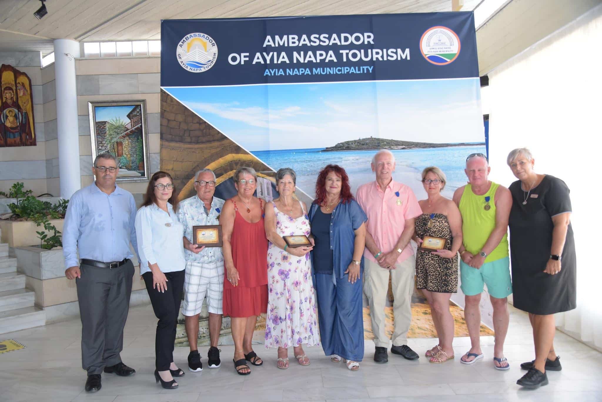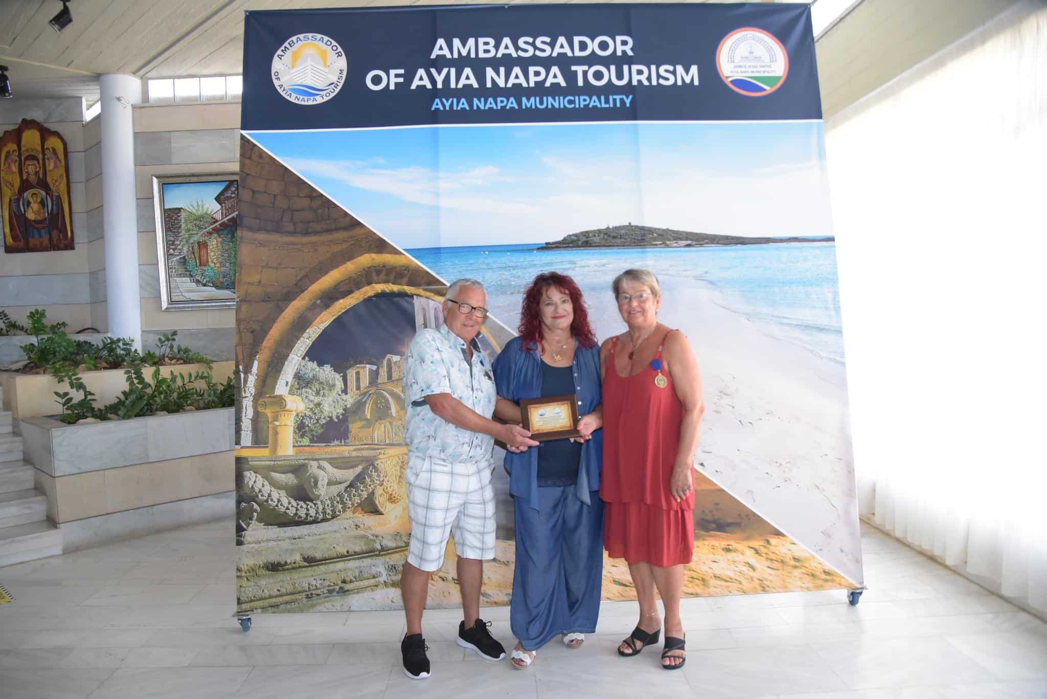 Με αναμνηστική πλακέτα και με το έμβλημα του «Πρέσβη Τουρισμού» της Αγίας Νάπας τιμήθηκαν από την Πολιτιστική Λειτουργό του Δήμου κυρία Μαρία Τοφινή Τσαντίλα δύο ζευγάρια από την Μεγάλη Βρετανία και ένα από την Ελβετία σε σεμνή τελετή που έγινε την Πέμπτη 22 Σεπτεμβρίου 2022 στο Δημοτικό Μέγαρο.