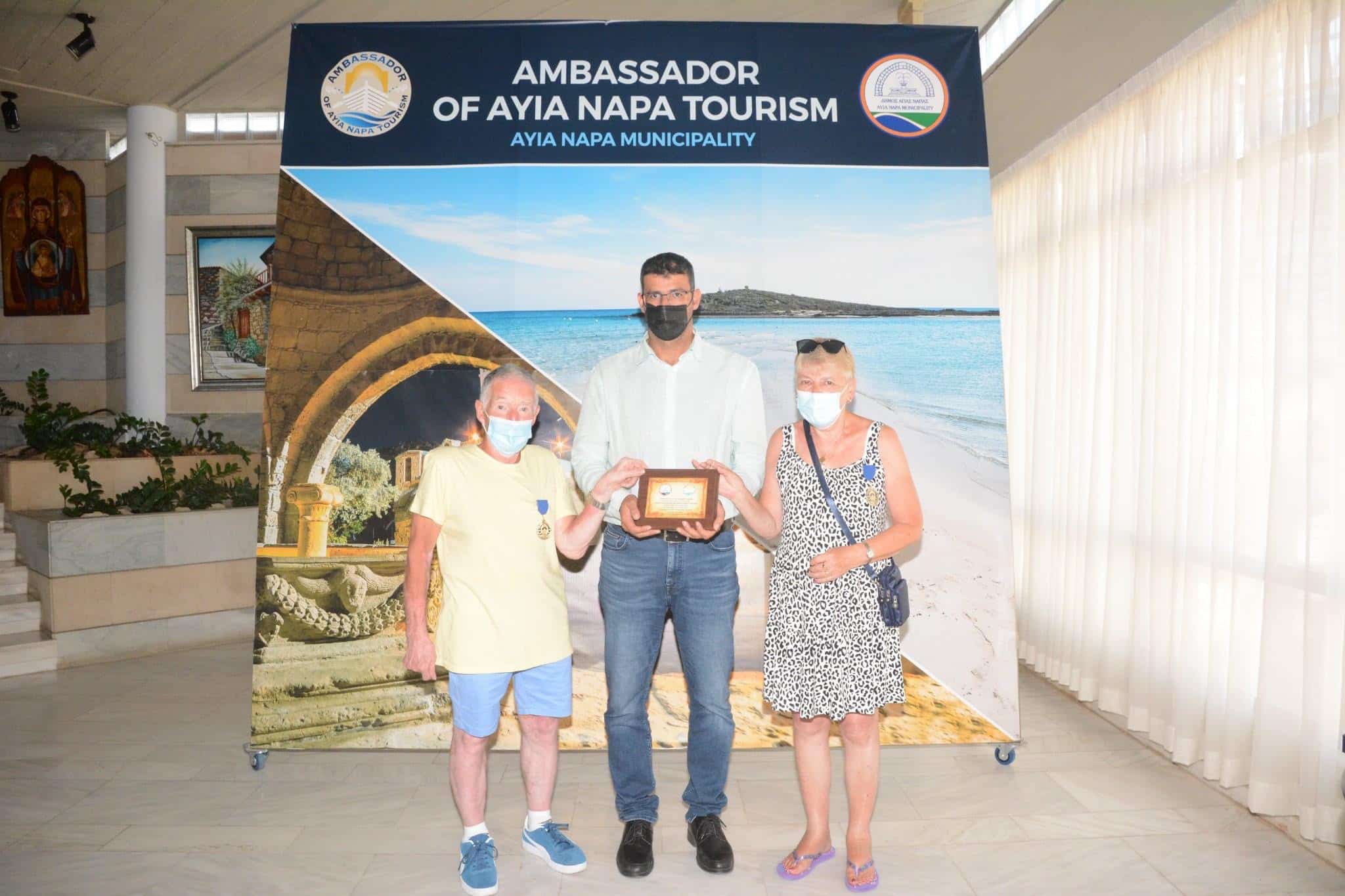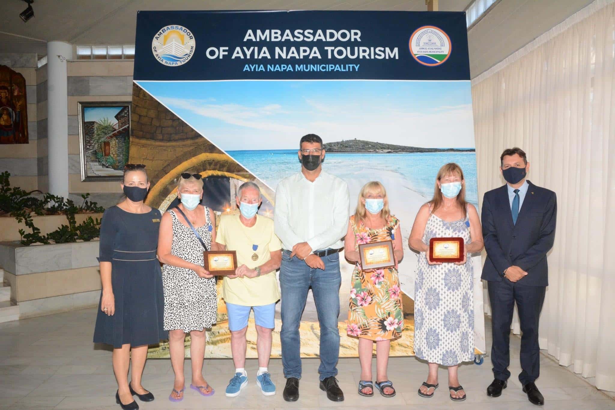 Σε γραπτή ανακοίνωση του Δήμου αναφέρεται ότι «το ζεύγος William John και Linda Elizabeth Dyer και οι Barbara Brown και Valerie Bray από τη Βρετανία, τιμήθηκαν ως «Πρέσβεις Τουρισμού» σε τελετή που πραγματοποιήθηκε σήμερα Πέμπτη 21 Ιουλίου, για τις τριάντα επισκέψεις τους στην Αγία Νάπα».