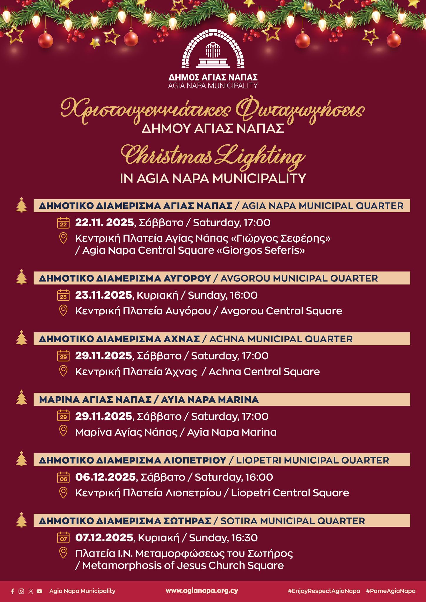 Την ερχόμενη εβδομάδα, το Σάββατο, 29 Νοεμβρίου 2025, στις 17:00, θα πραγματοποιηθούν δύο φωταγωγήσεις: στο Δημοτικό Διαμέρισμα Άχνας, στην Κεντρική Πλατεία Άχνας, καθώς και στη Μαρίνα Αγίας Νάπας. Η εορταστική περίοδος συνεχίζεται το Σάββατο, 6 Δεκεμβρίου 2025, στις 16:00, με τη φωταγώγηση στο Δημοτικό Διαμέρισμα Λιοπετρίου, στην Κεντρική Πλατεία Λιοπετρίου.
