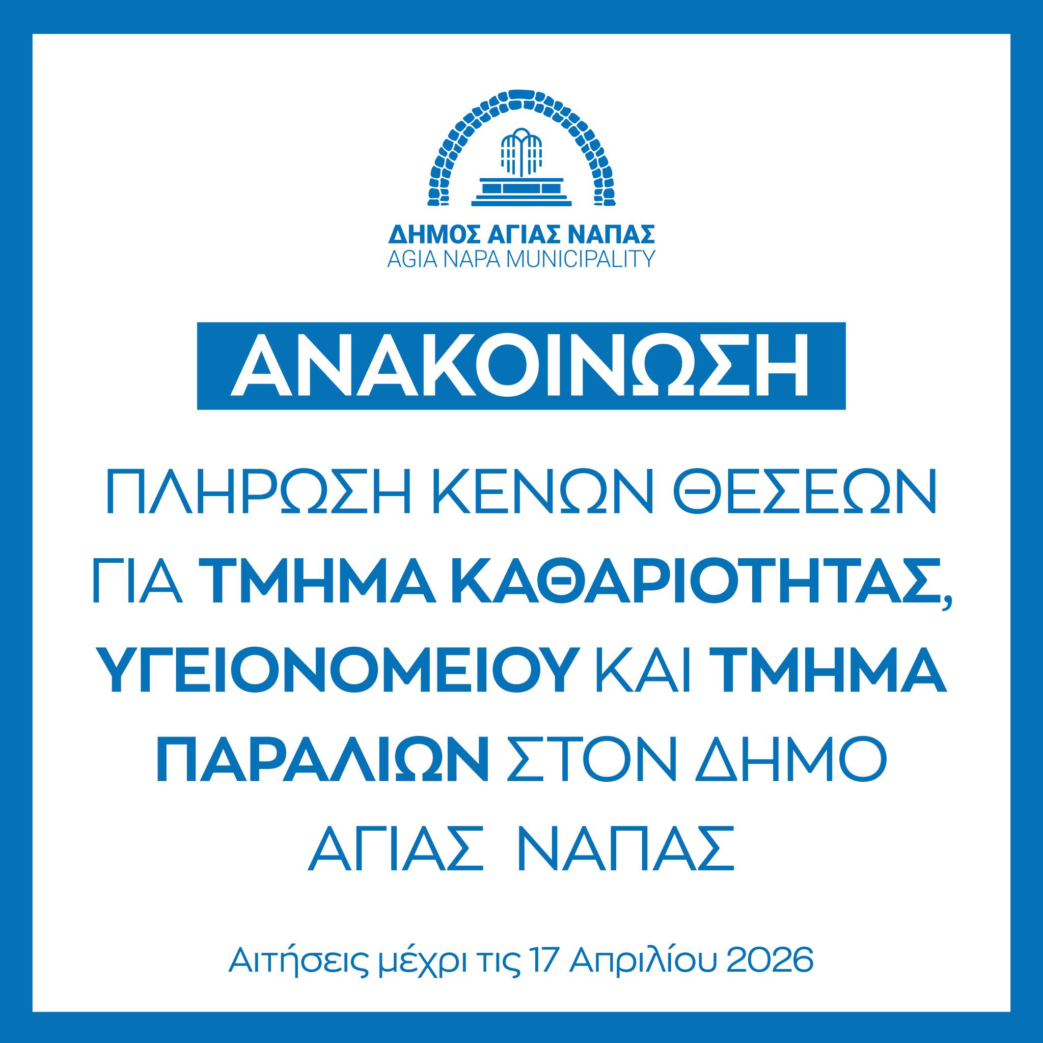 Ο Δήμος Αγίας Νάπας δέχεται αιτήσεις μέχρι τις 17 Απριλίου 2026 και ώρα 12:00 μ.μ., για πρόσληψη του αντίστοιχου αριθμού έκτακτου – εποχιακού εργατικού προσωπικού για τις πιο κάτω θέσεις με την αντίστοιχη μισθοδοσία, για κάλυψη αναγκών συνεργείων του Δήμου Αγίας Νάπας (Δημοτικών Διαμερισμάτων Σωτήρας, Αυγόρου, Άχνας, Λιοπετρίου, Αγίας Νάπας).