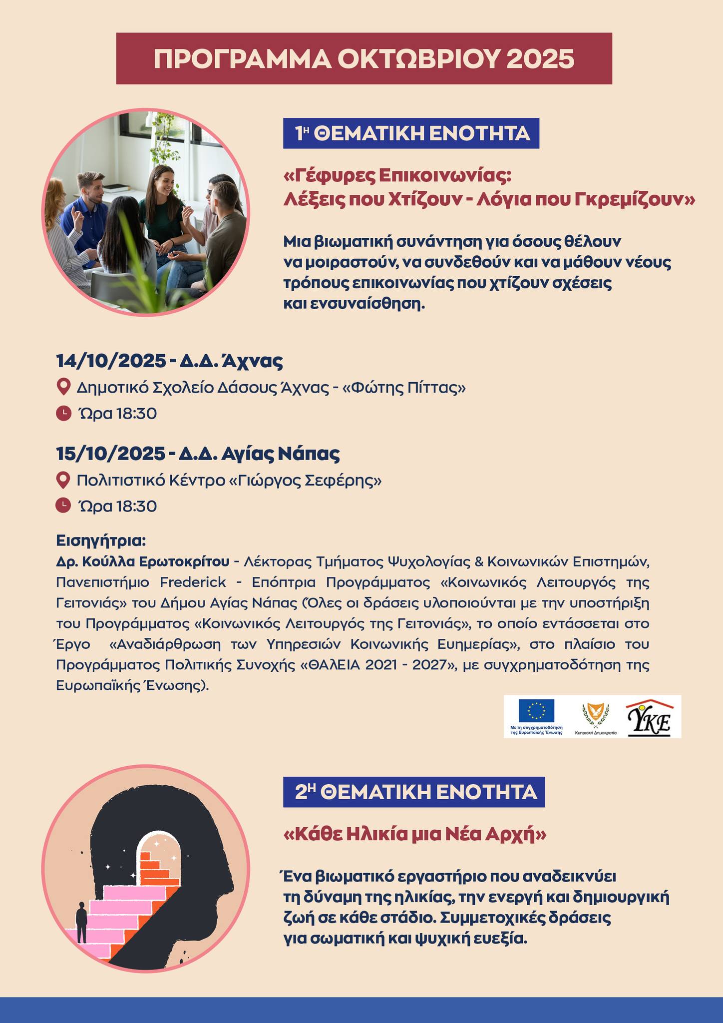 Οι συναντήσεις θα πραγματοποιηθούν την Τρίτη 14 Οκτωβρίου 2025, στο Δημοτικό Σχολείο Δάσους Άχνας «Φώτης Πίττας», στις 18:30, και την Τετάρτη 15 Οκτωβρίου 2025, στο Πολιτιστικό Κέντρο Αγίας Νάπας «Γιώργος Σεφέρης», στις 18:30. Εισηγήτρια της ενότητας είναι η Δρ. Κούλα Ερωτοκρίτου, Λέκτορας του Τμήματος Ψυχολογίας & Κοινωνικών Επιστημών του Πανεπιστημίου Frederick και Επόπτρια του Προγράμματος «Κοινωνικός Λειτουργός της Γειτονιάς» του Δήμου Αγίας Νάπας.